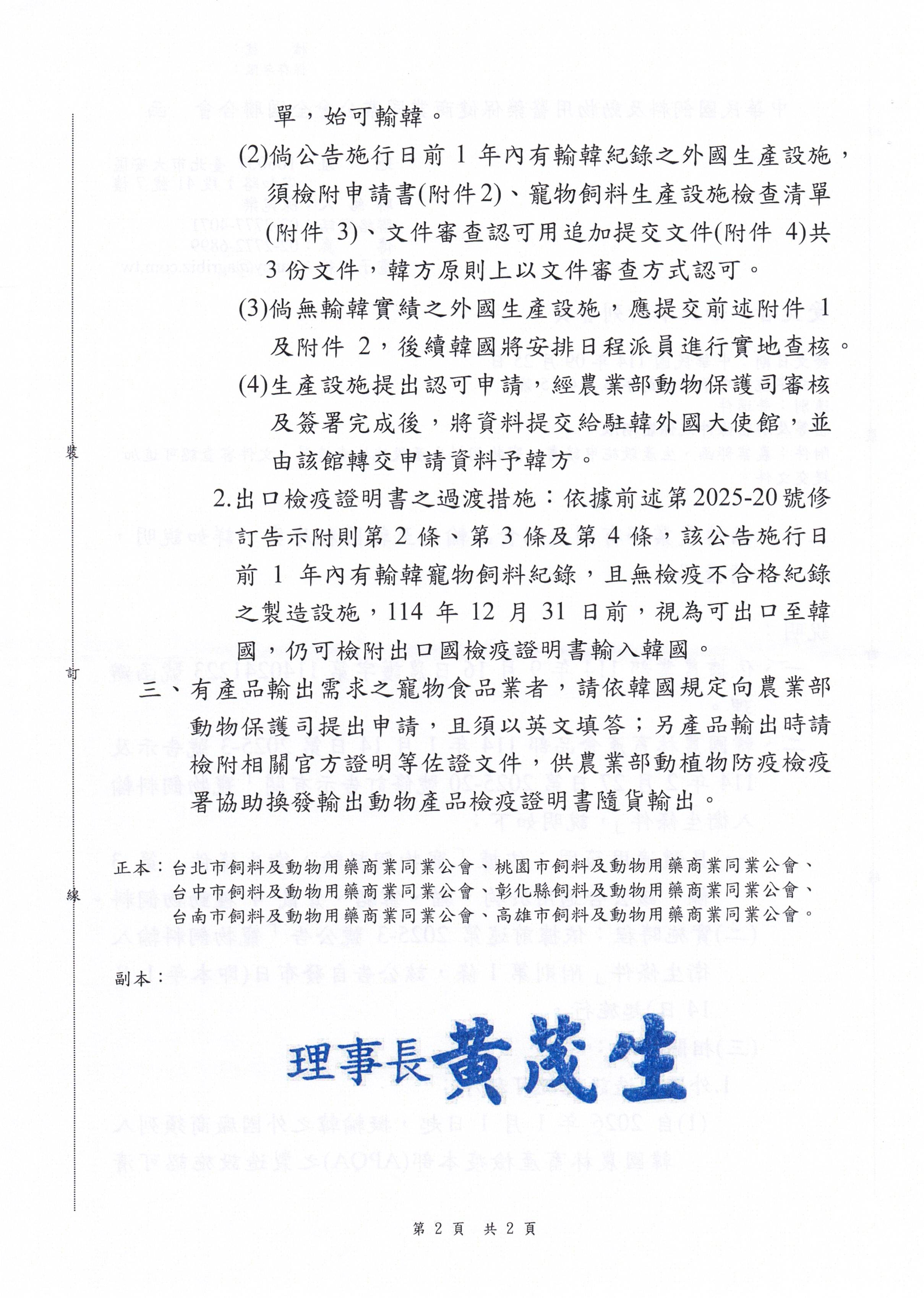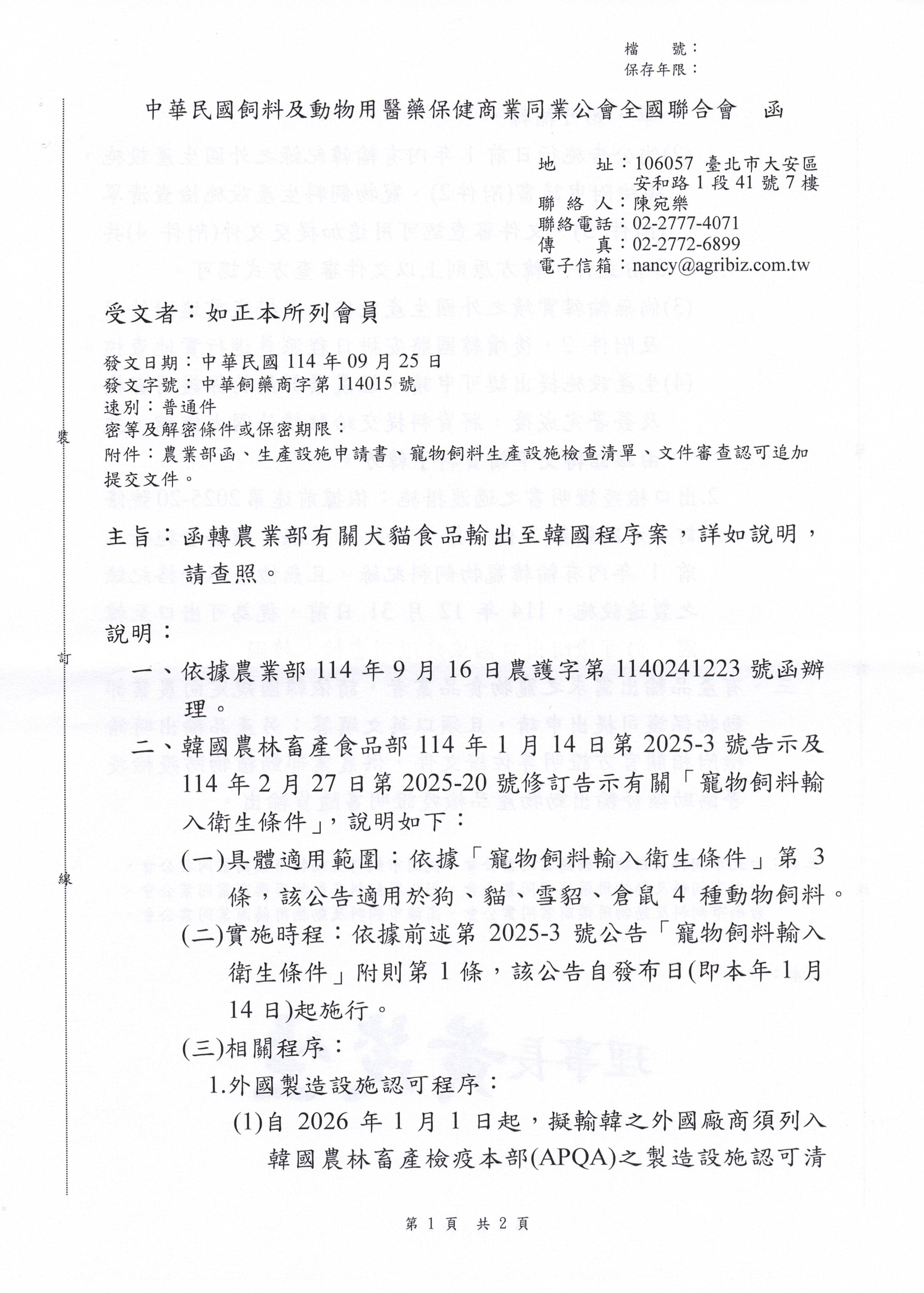 犬貓食品輸出至韓國程序案,詳如說明,請查照