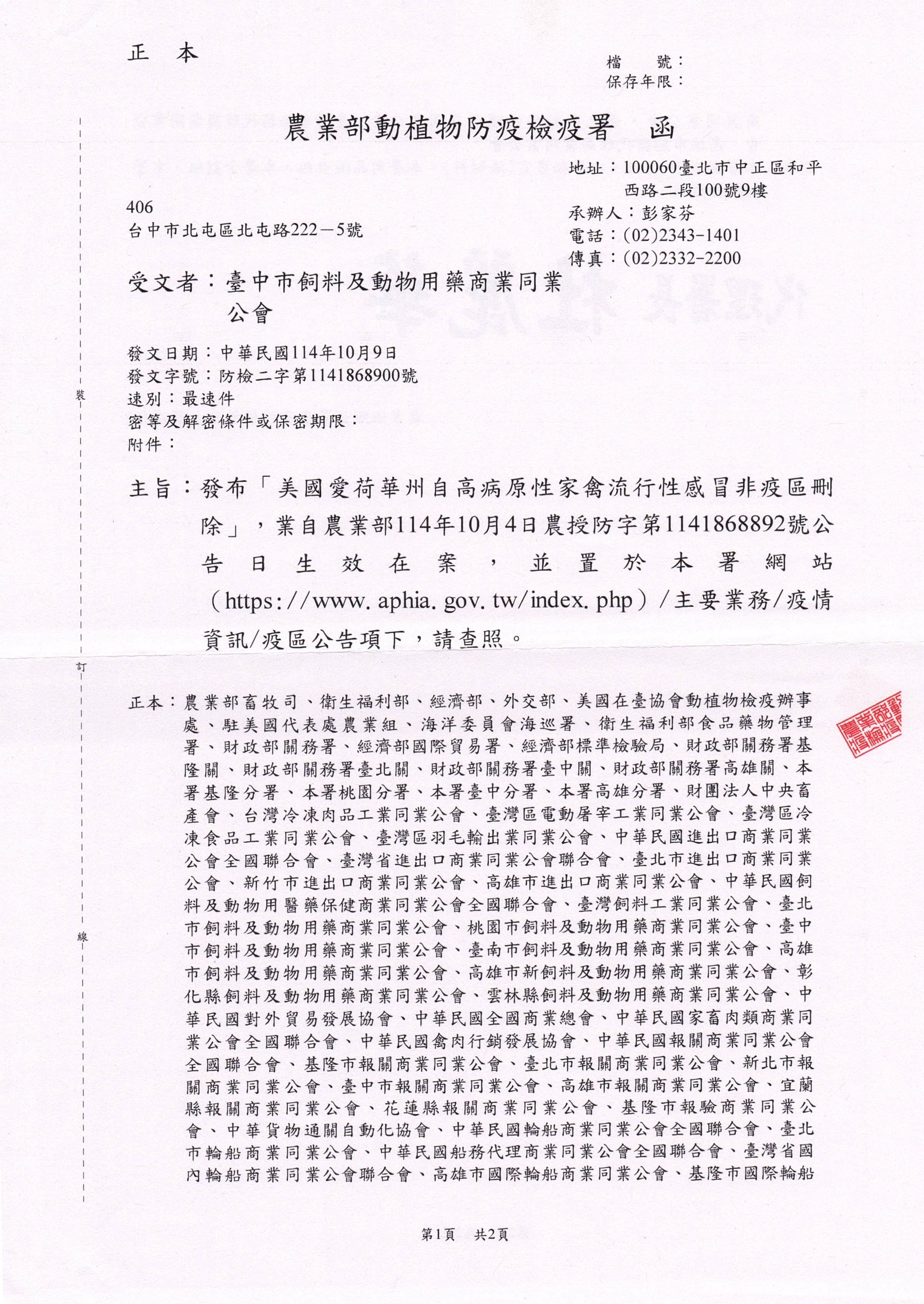 「美國猶他州及美國愛荷華州自高病原性家禽流行性感冒非疫區刪除」