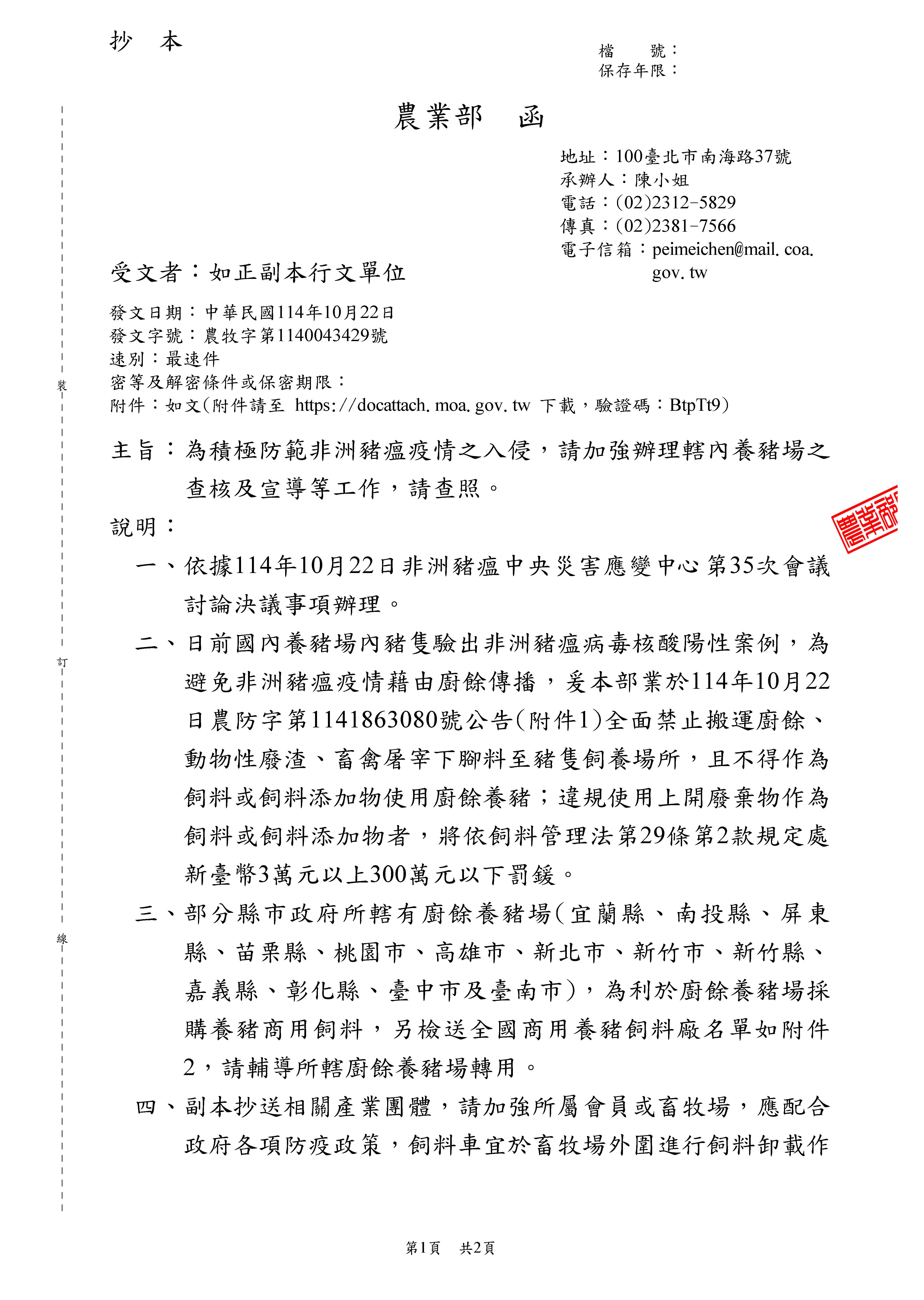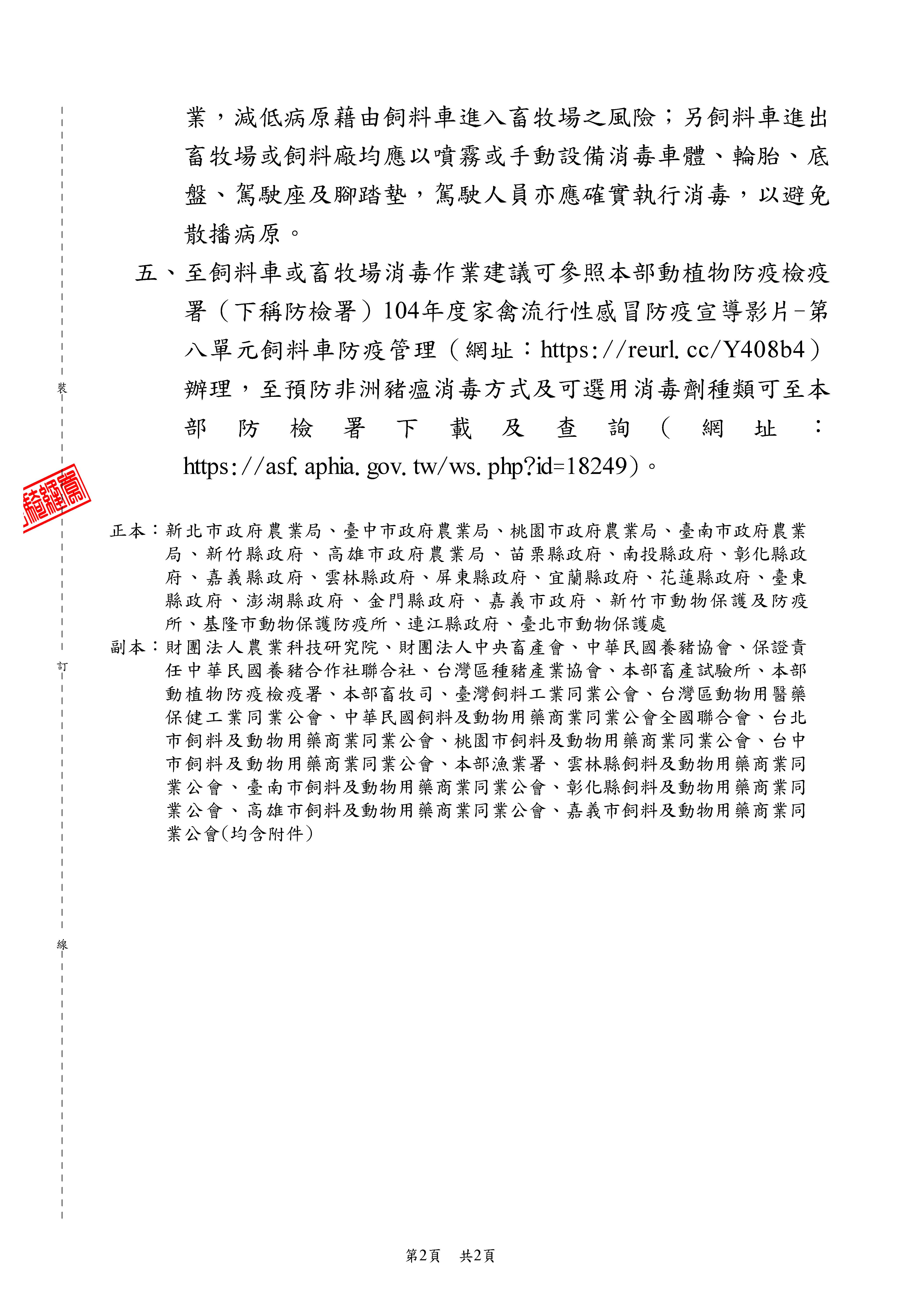為積極防範非洲豬瘟疫情之入侵,請加強辦理轄內養豬場之查核及宣導等工作