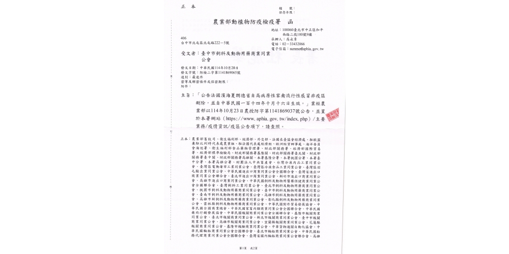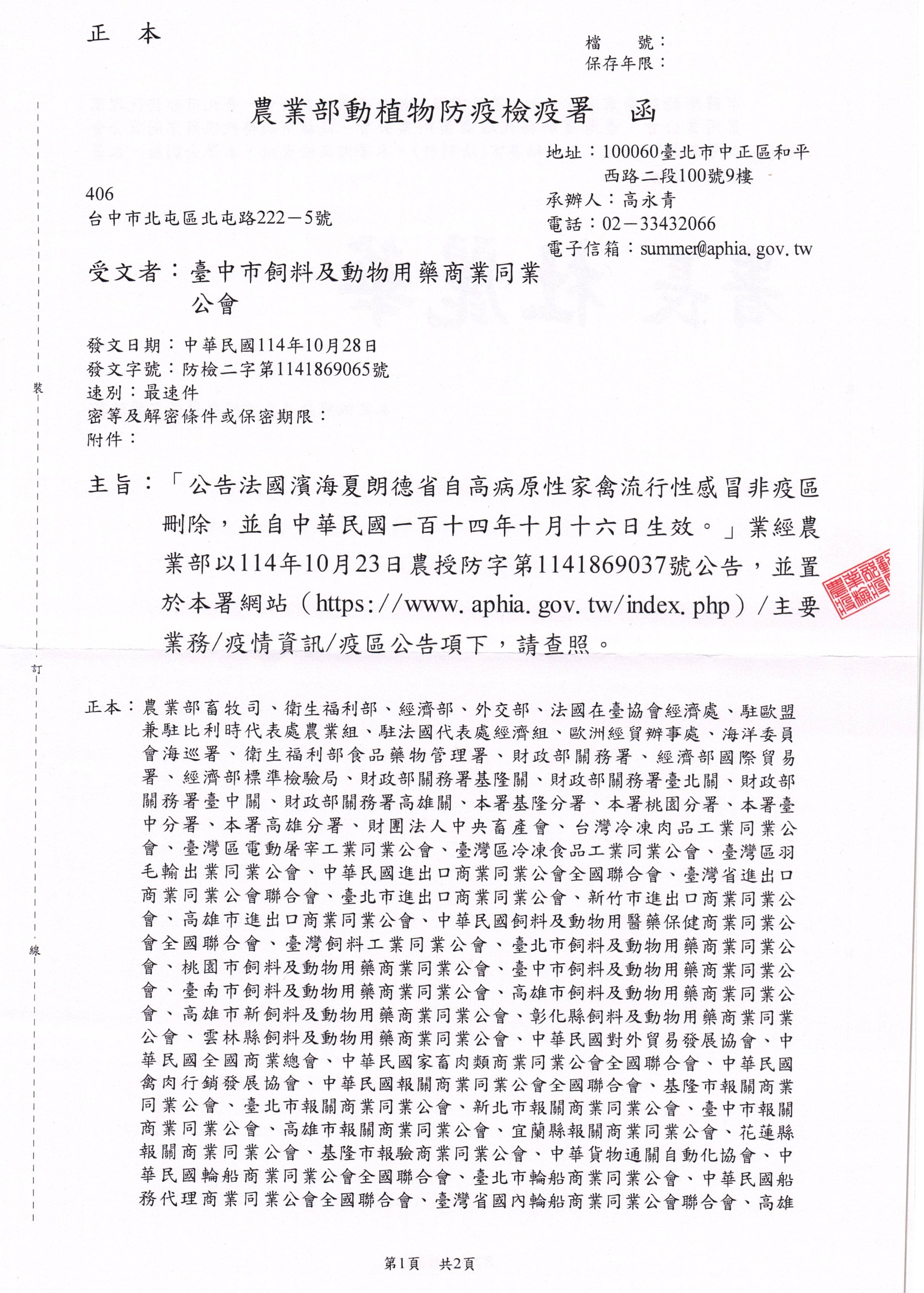 法國濱海夏朗德省自高病原性家禽流行性感冒非疫區刪除