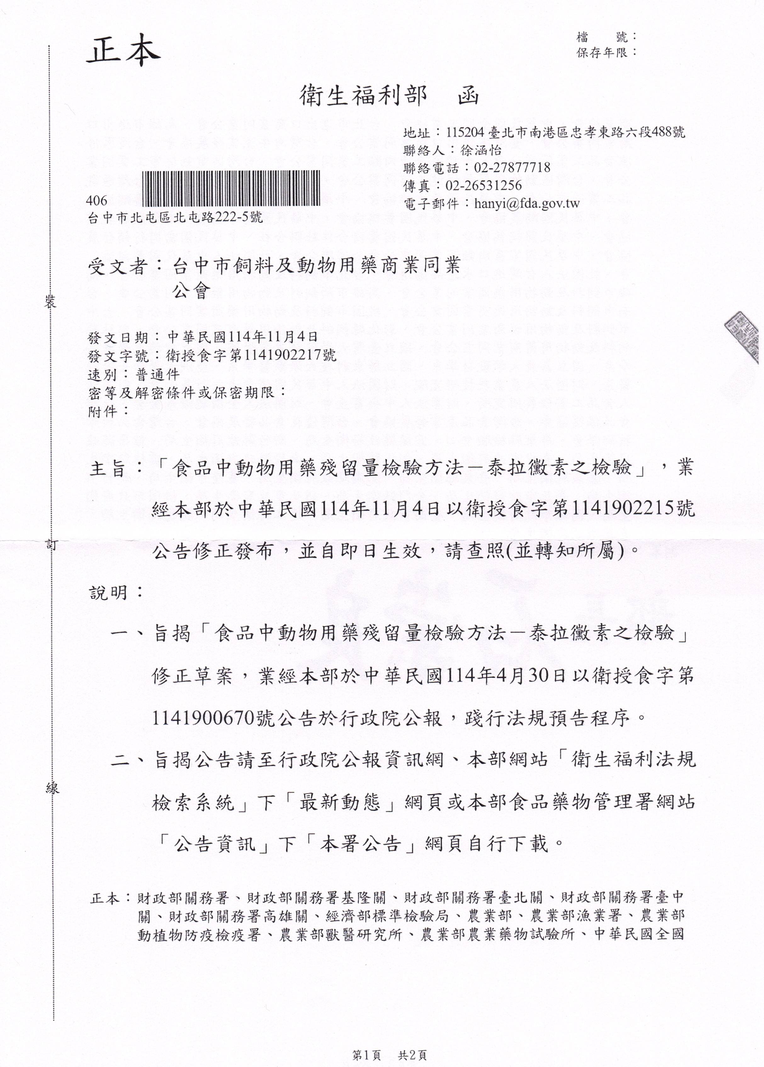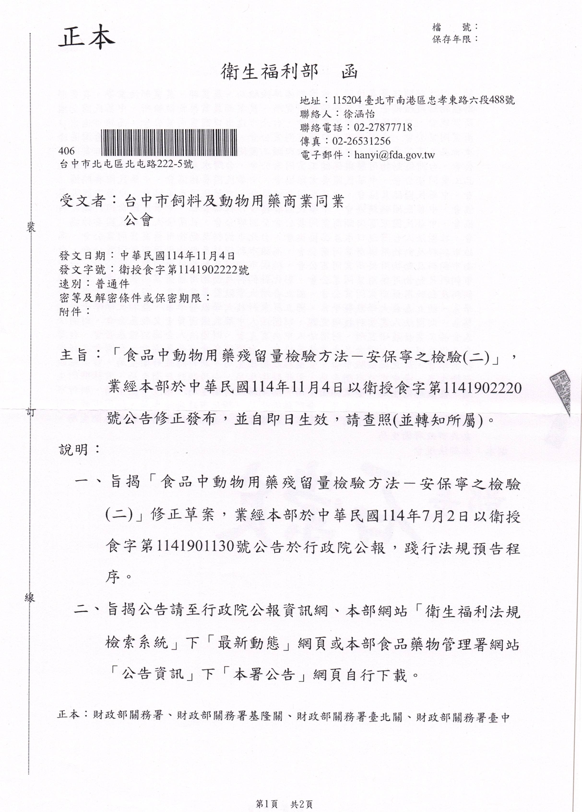 「食品中動物用藥殘留量檢驗方法-泰拉黴素之檢驗」、「食品中動物用藥殘留量檢驗方法-安保寧之檢驗(二)」