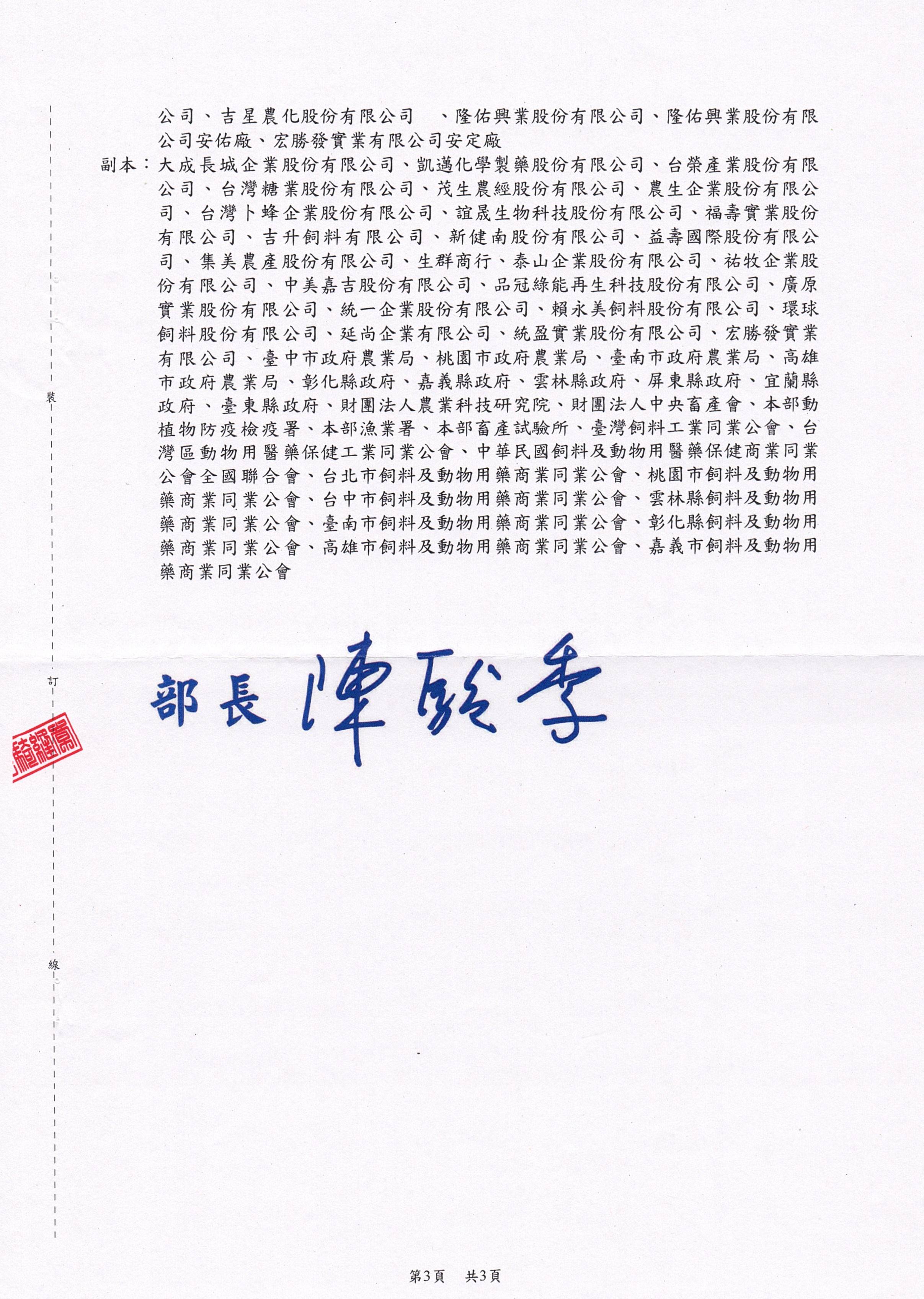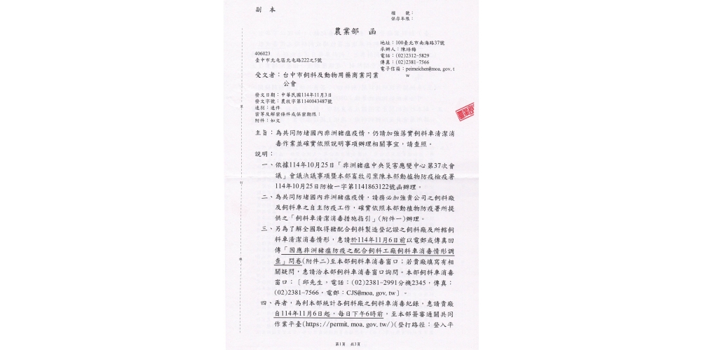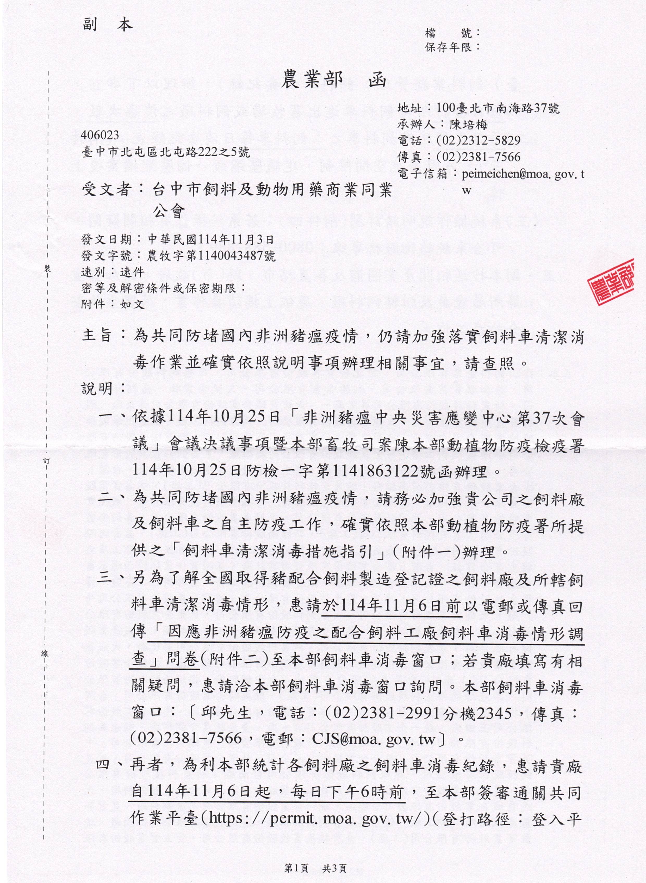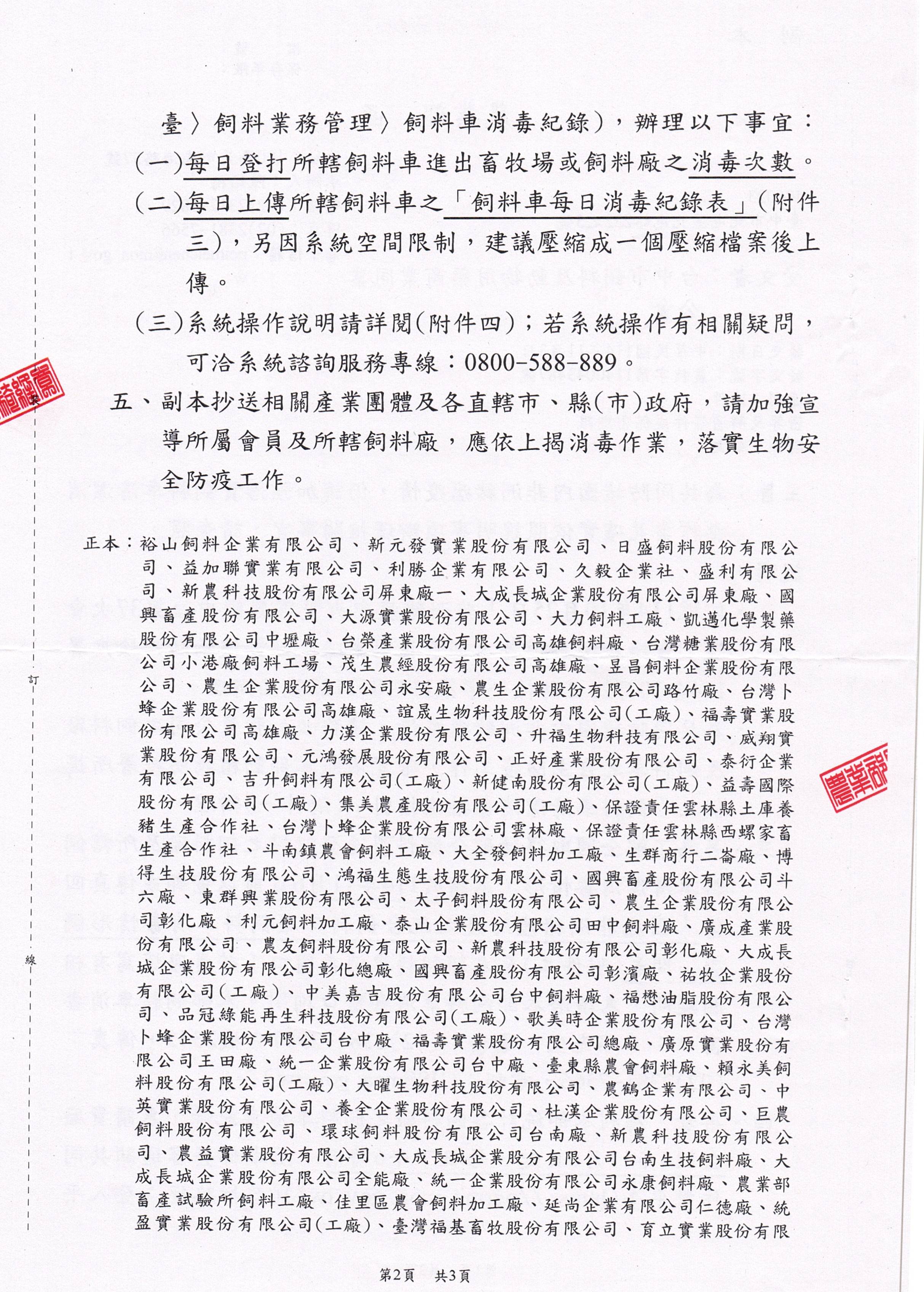 有關防堵國內非洲豬瘟疫情,仍請加強落實飼料車清潔消毒作業並確實依照說明事項辦理相關事宜