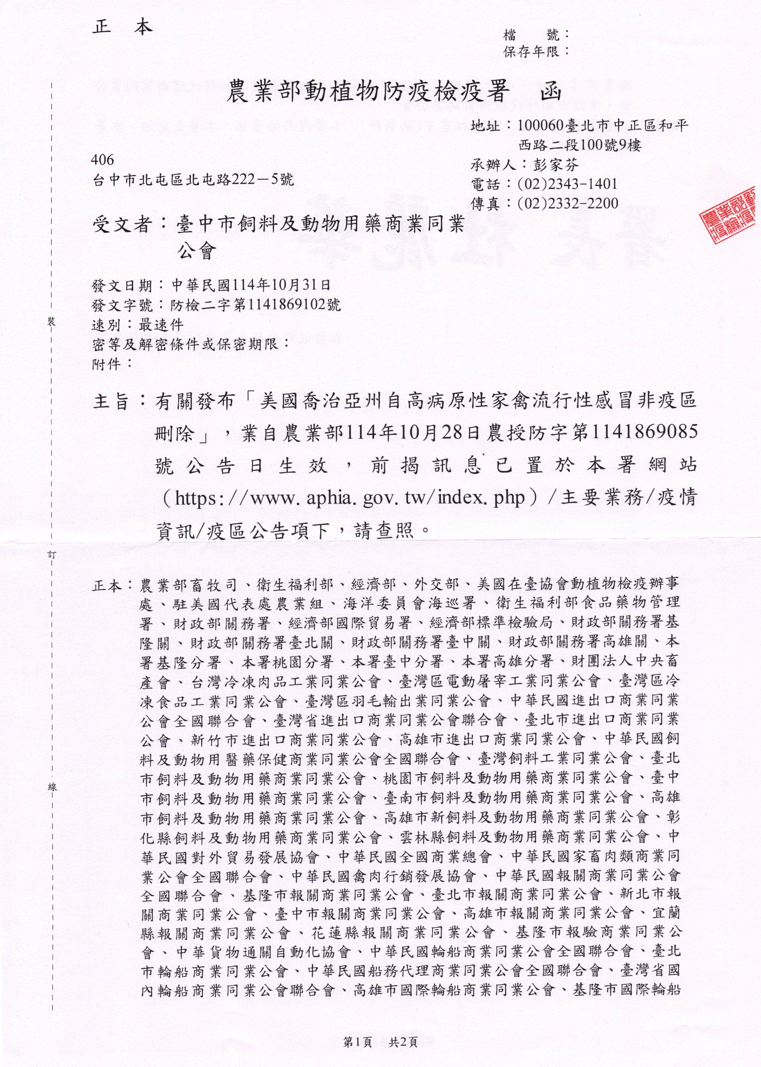 「美國喬治亞州自高病原性家禽流行性感冒非疫區刪除」