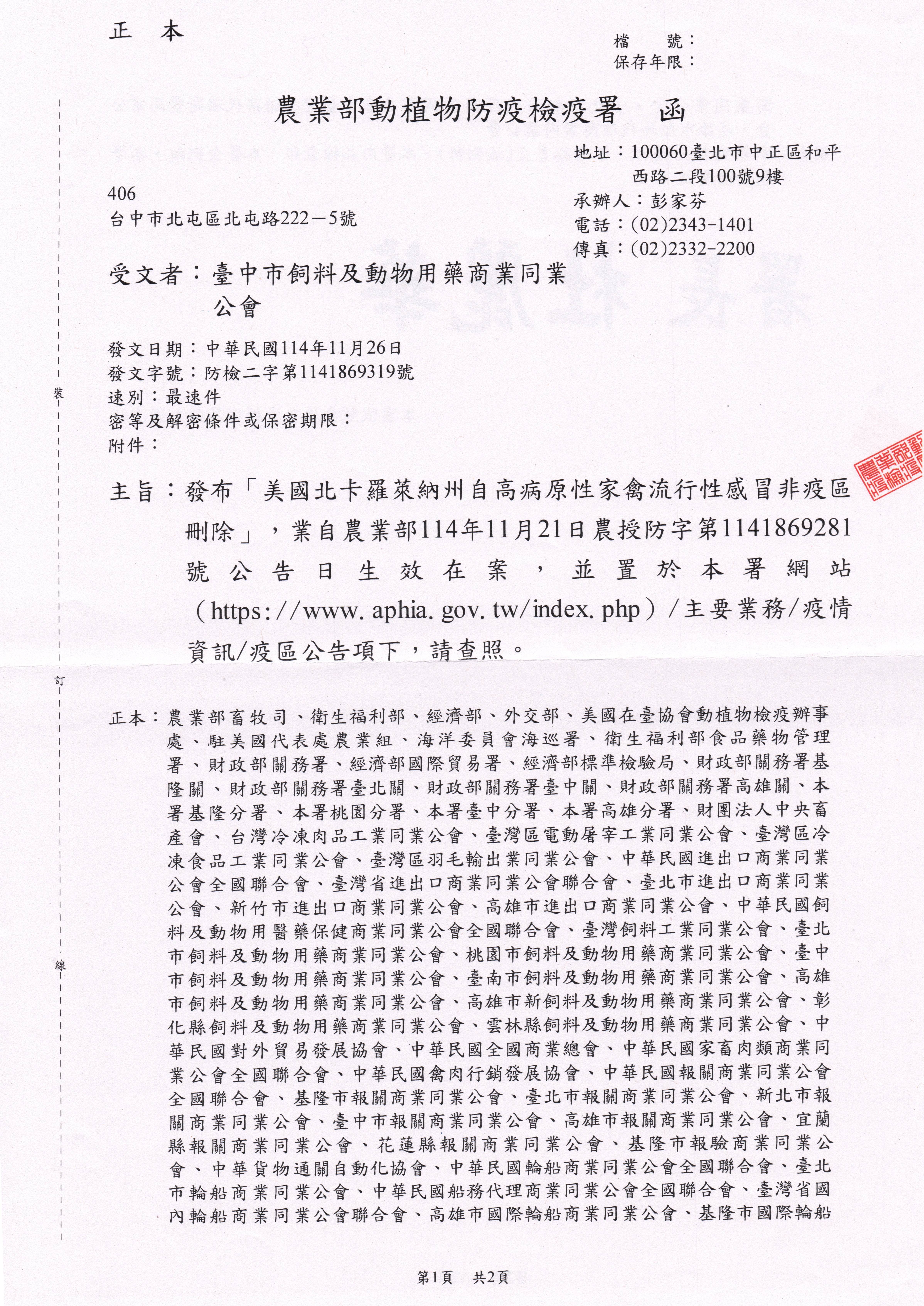 「美國北卡羅萊納州自高病原性家禽流行性感冒非疫區刪除」