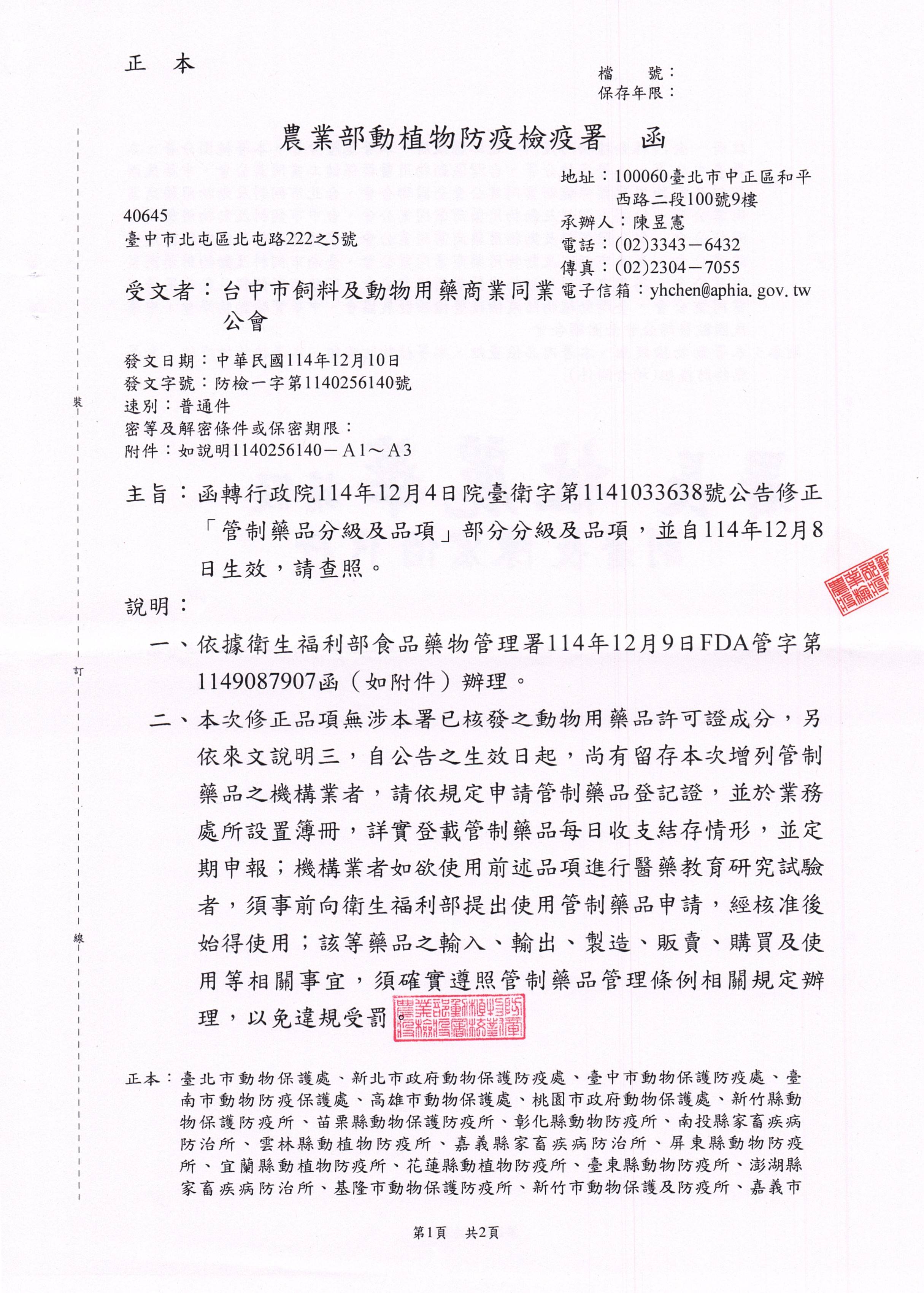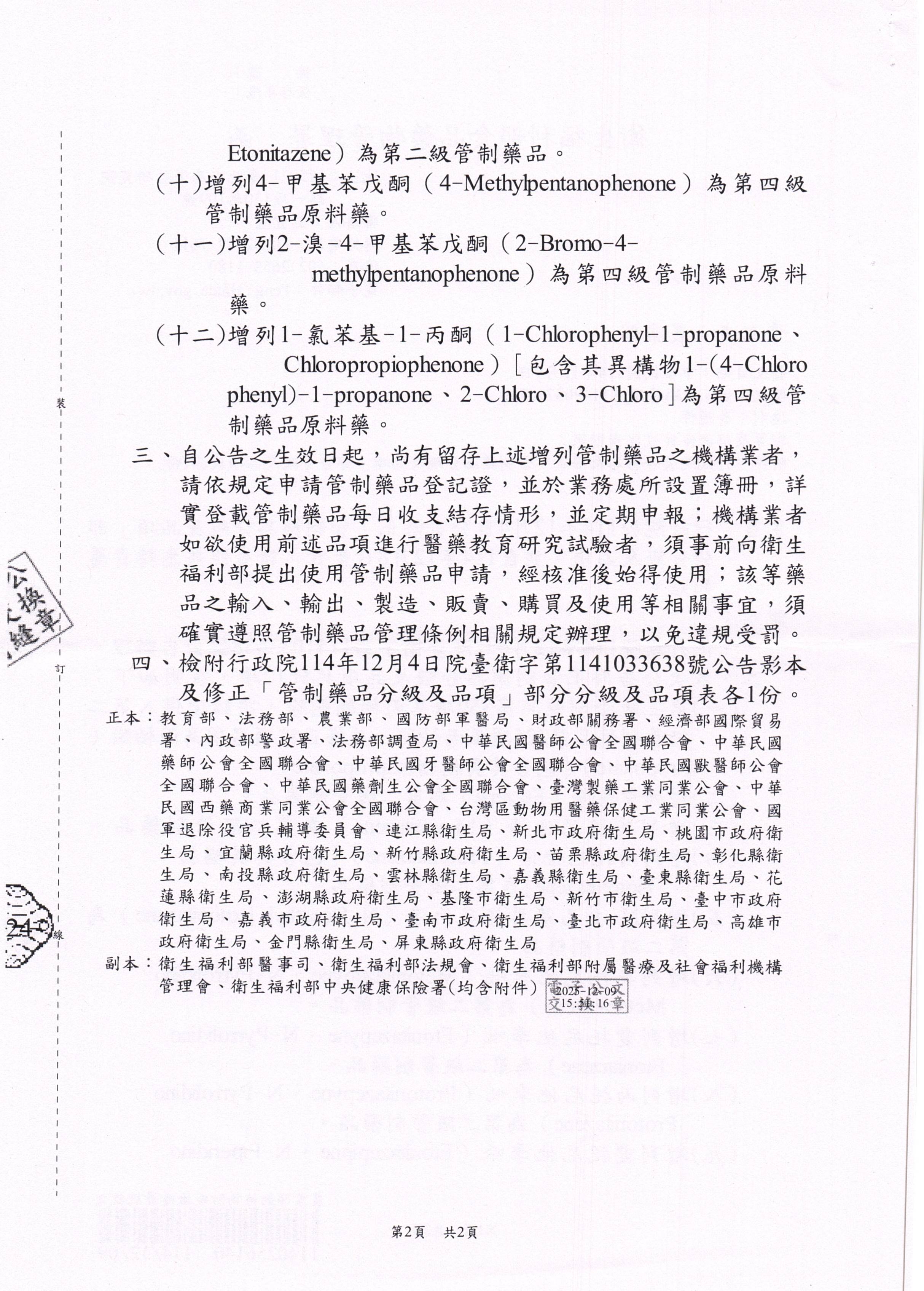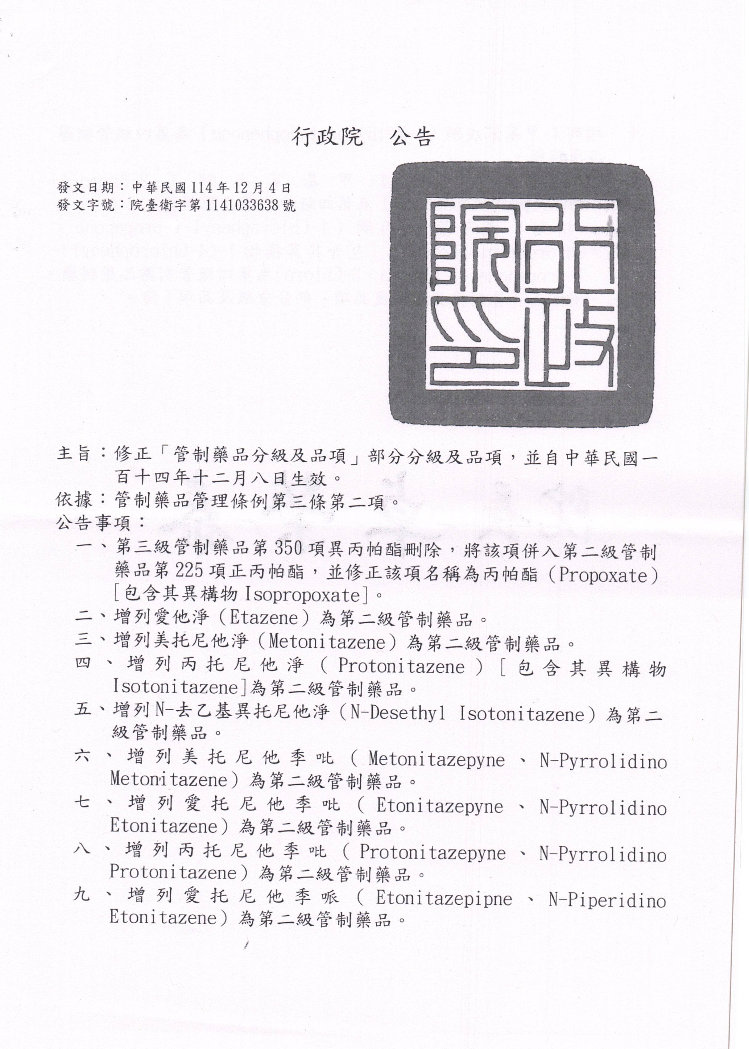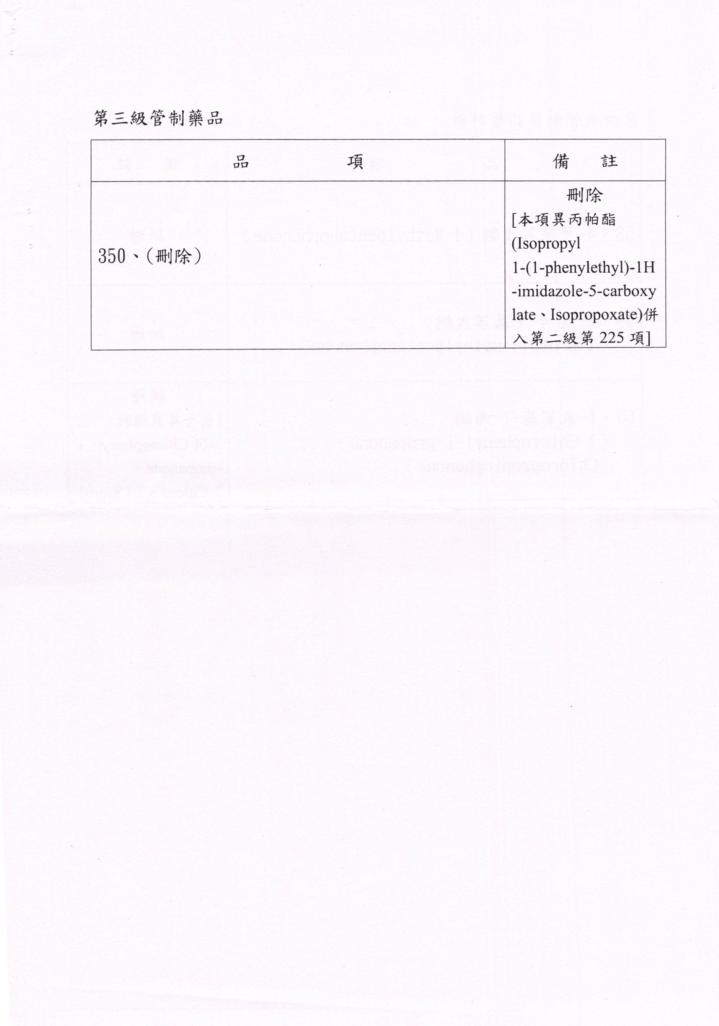 「管制藥品分級及品項」部分分級及品項