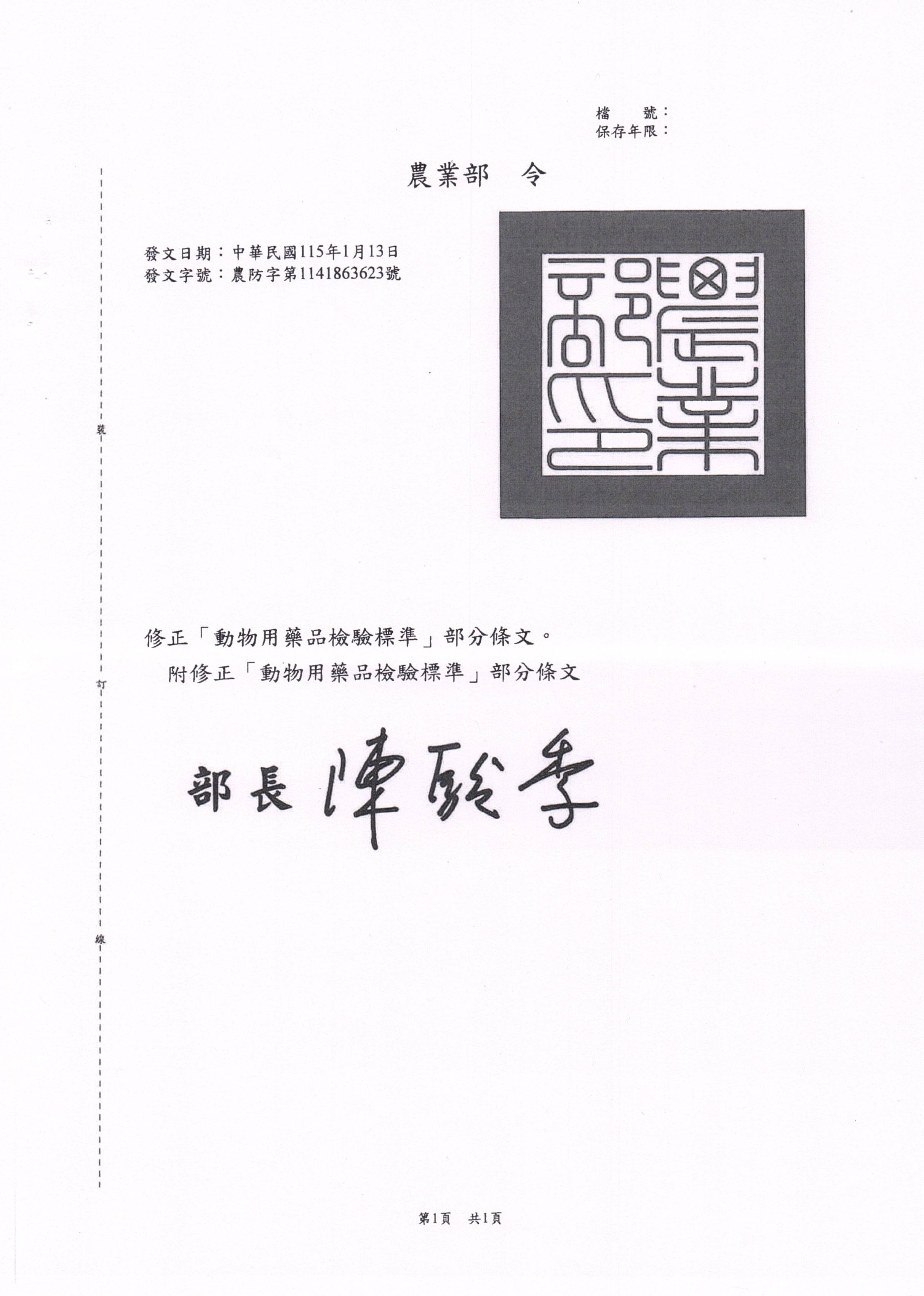 「動物用藥品檢驗標準」部分條文, 請查照。