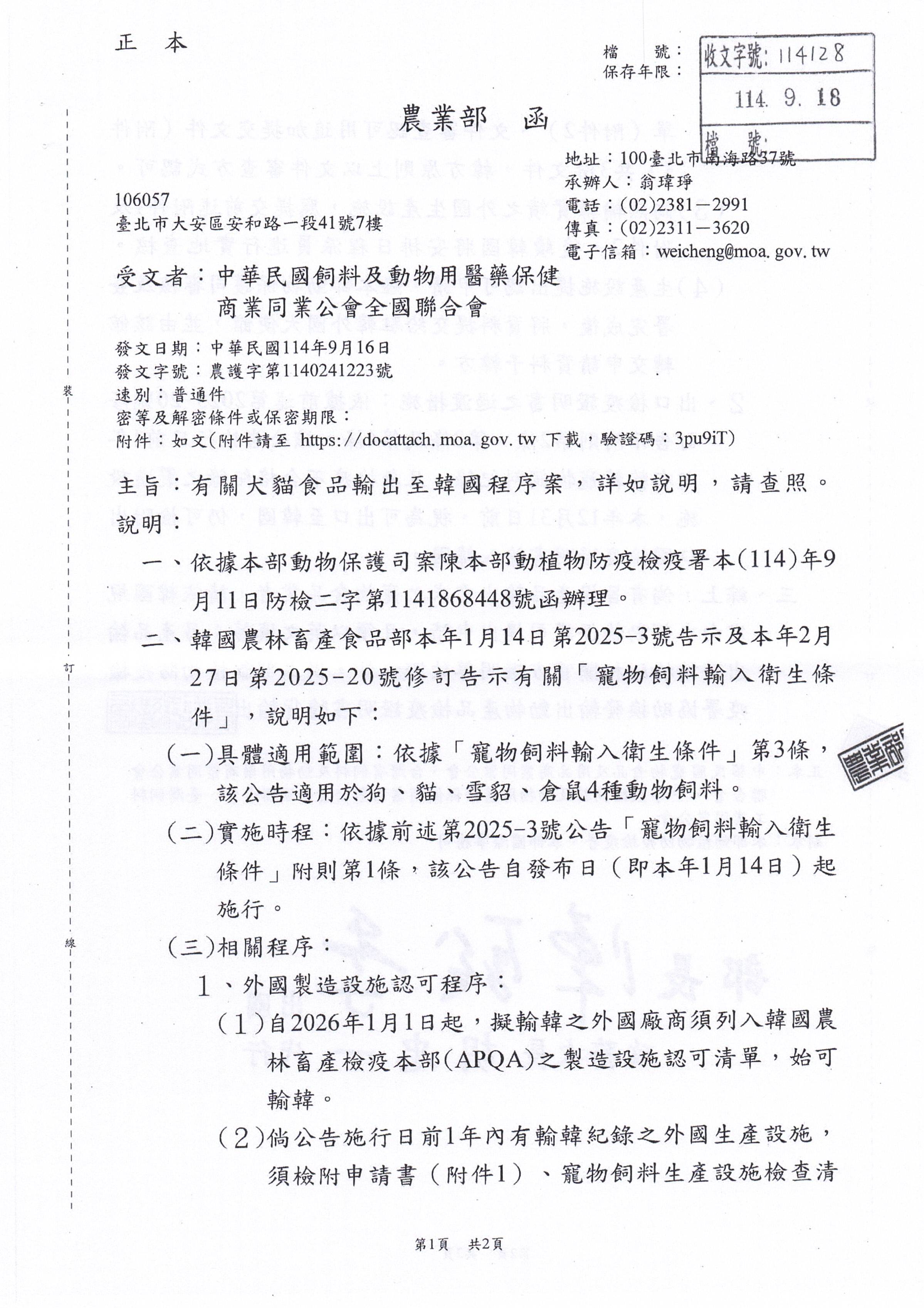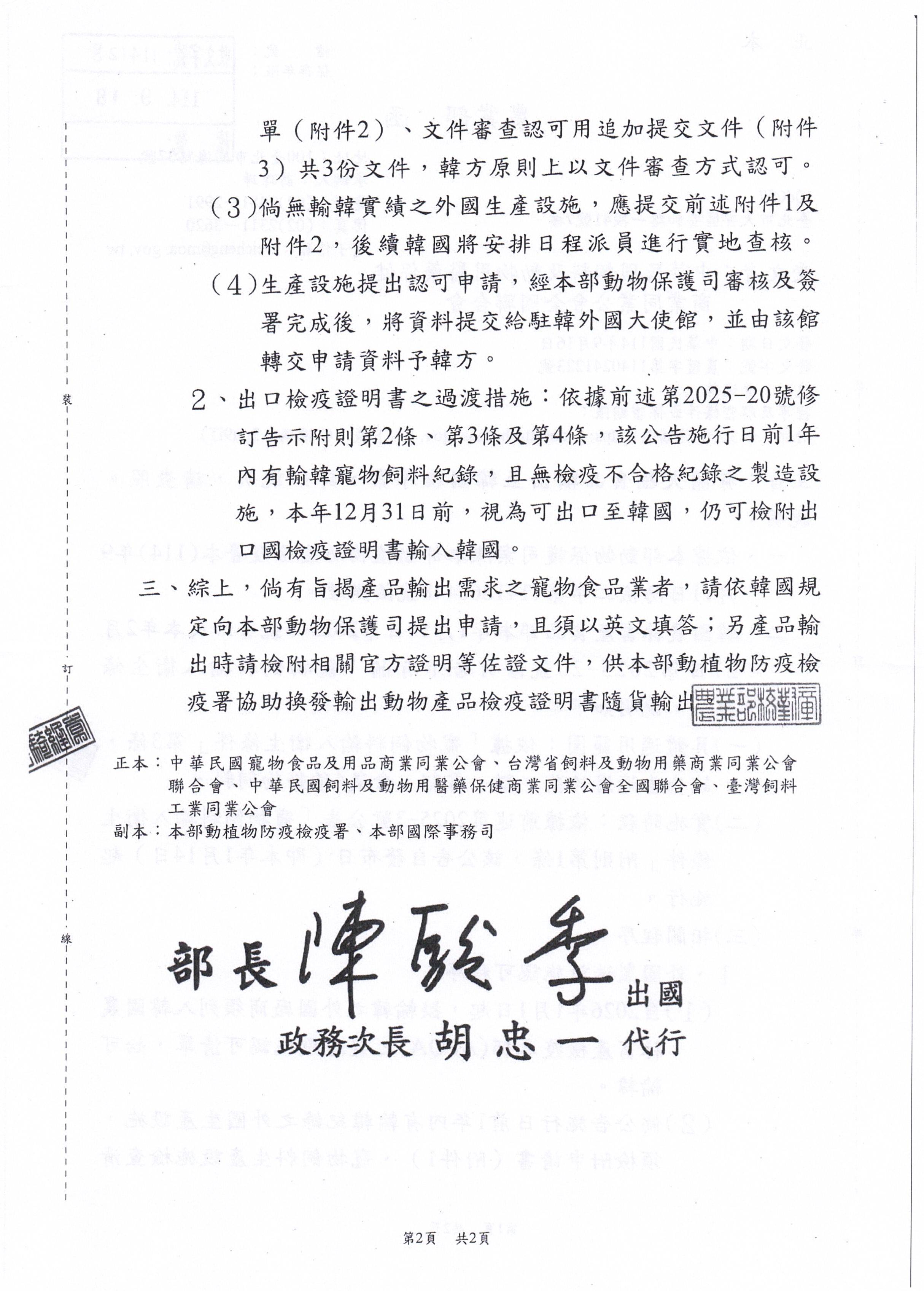犬貓食品輸出至韓國程序案,詳如說明,請查照