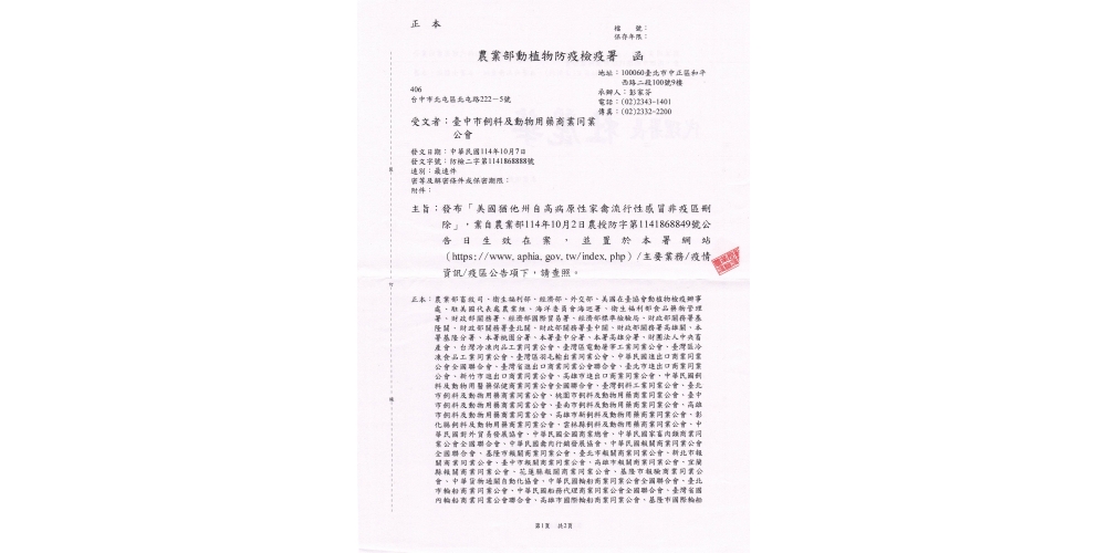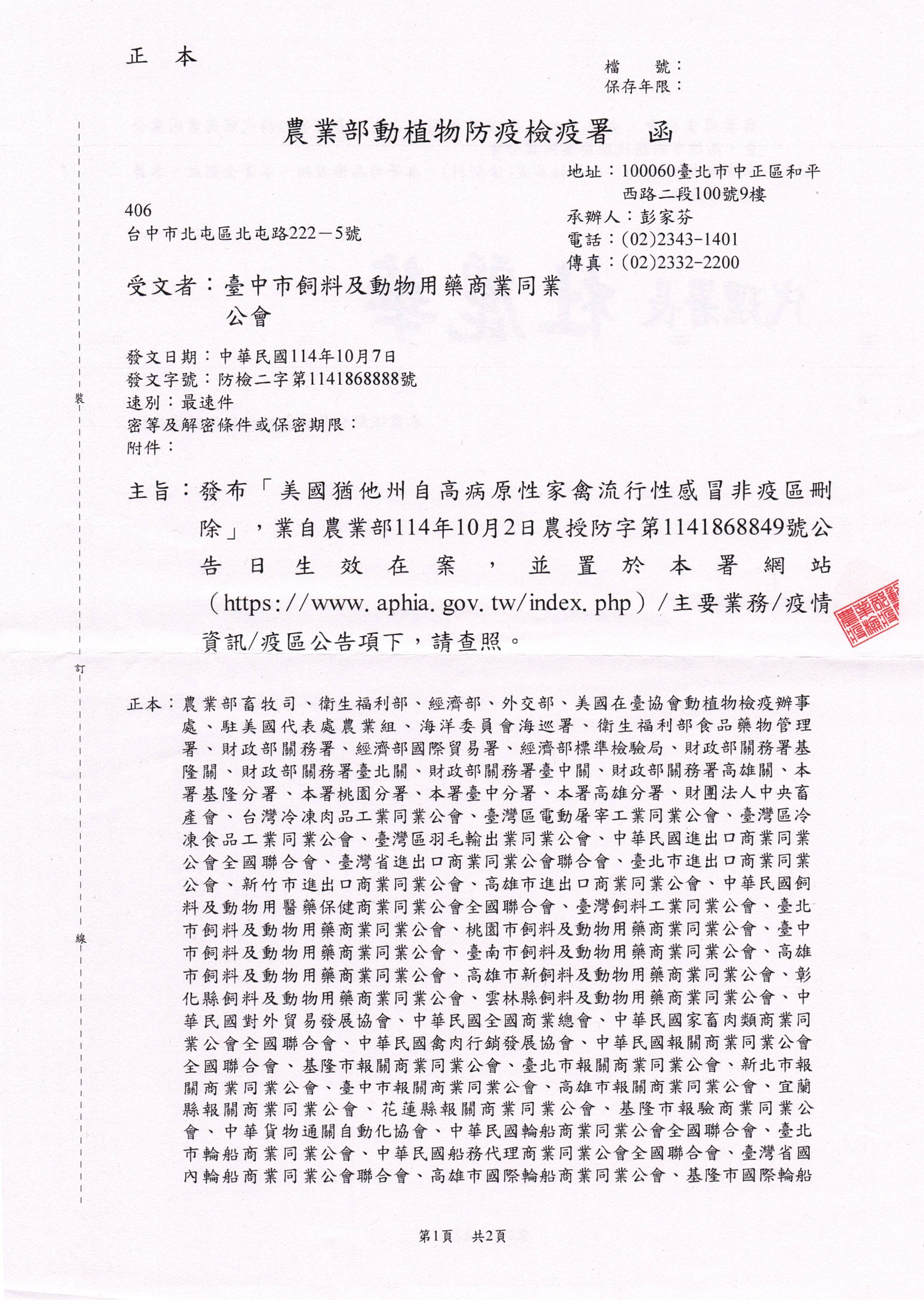 「美國猶他州及美國愛荷華州自高病原性家禽流行性感冒非疫區刪除」
