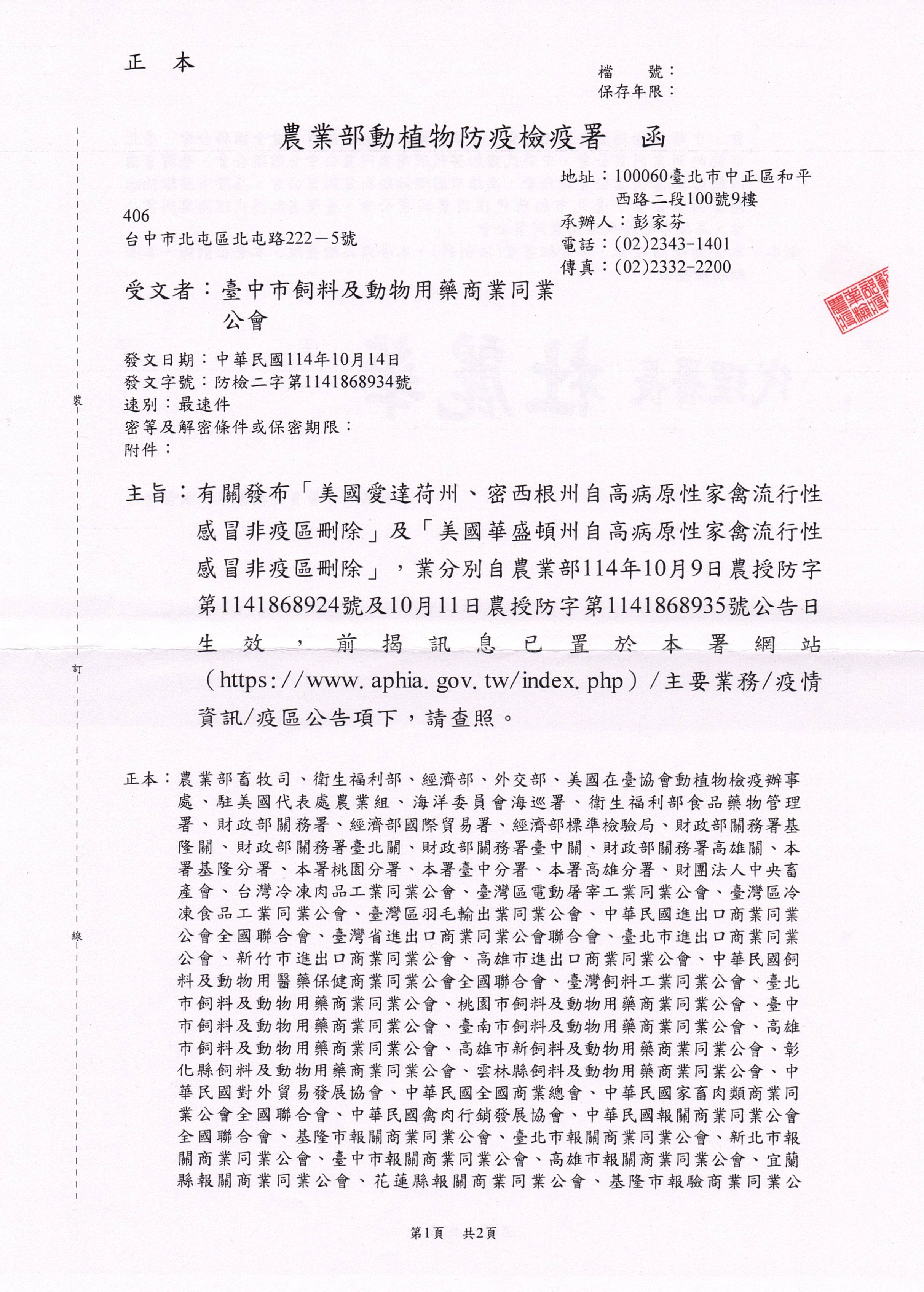 「美國愛達荷州、密西根州自高病原性家禽流行性感冒非疫區刪除」