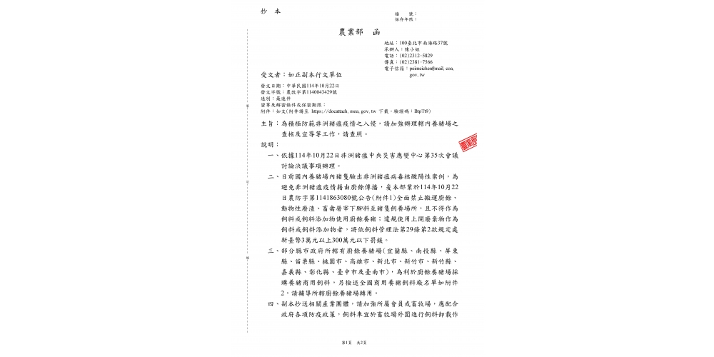 為積極防範非洲豬瘟疫情之入侵,請加強辦理轄內養豬場之查核及宣導等工作