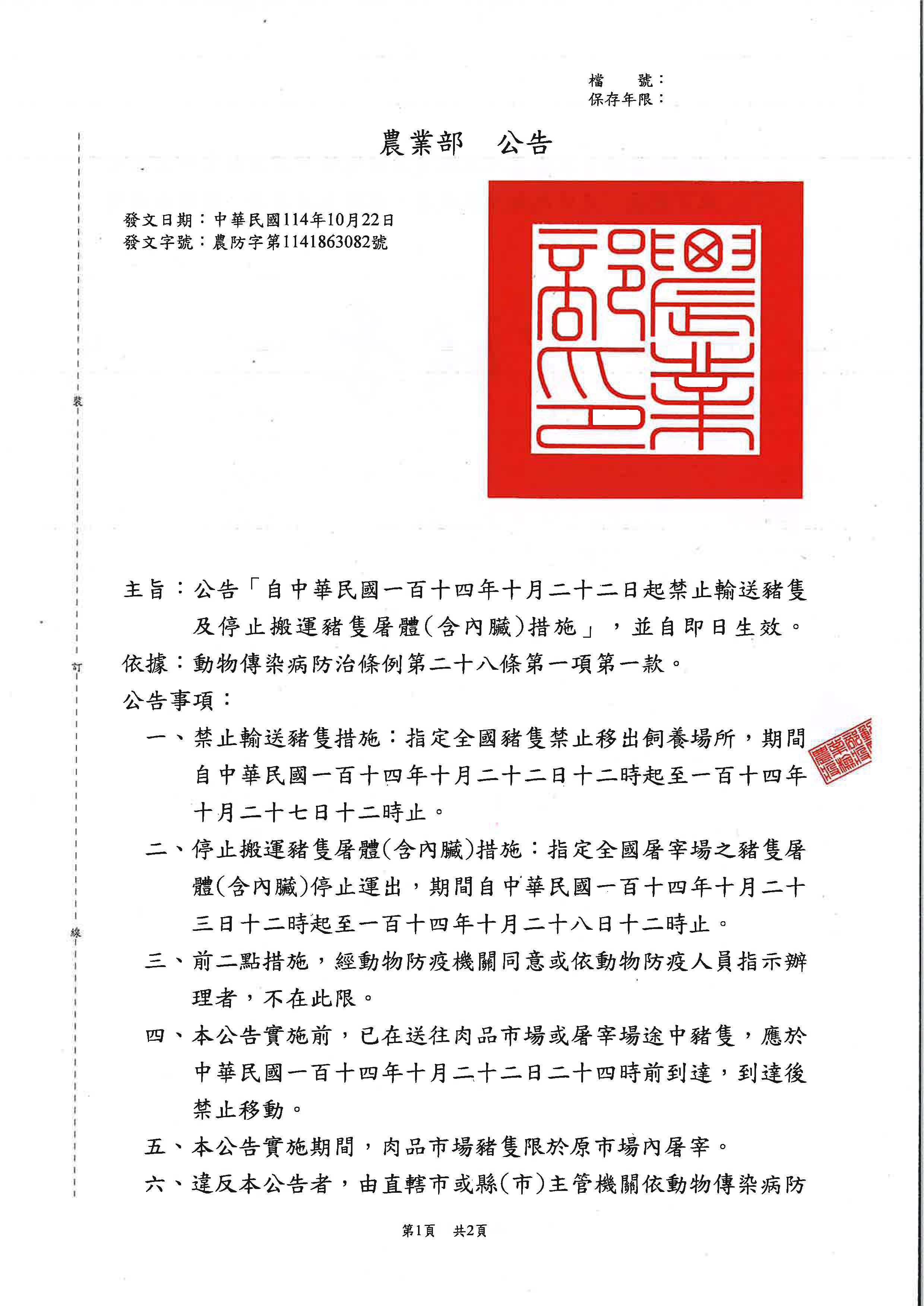 禁止輸送豬隻及停止搬運豬隻屍體措施