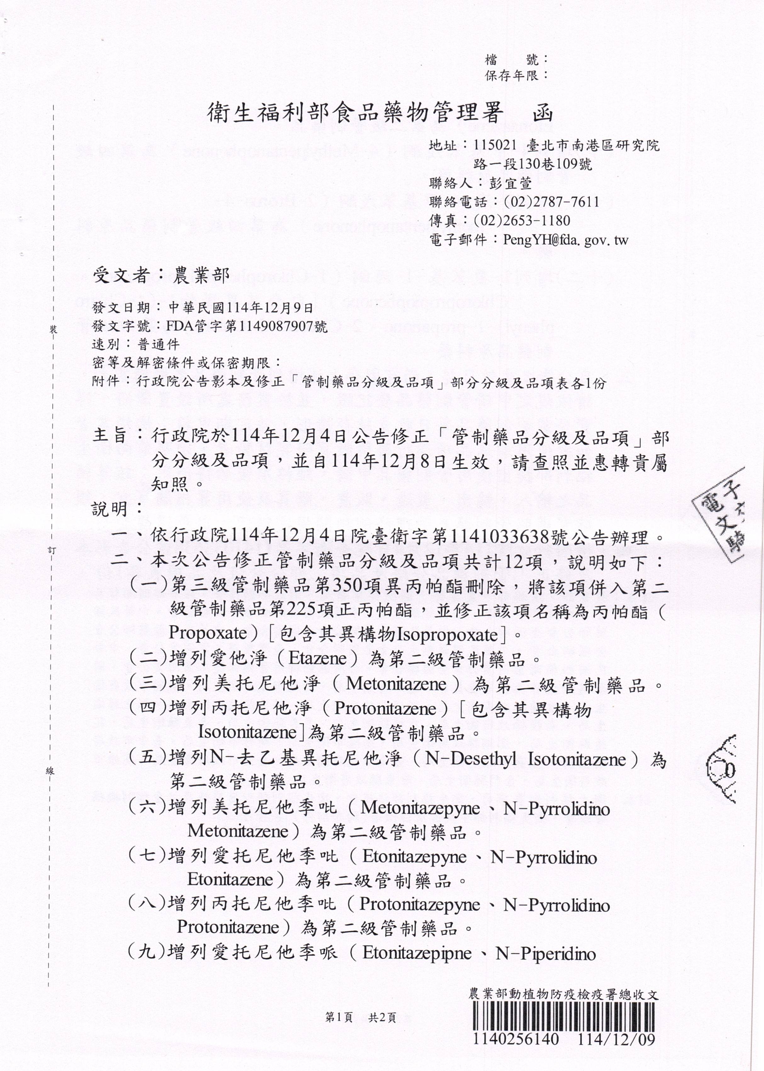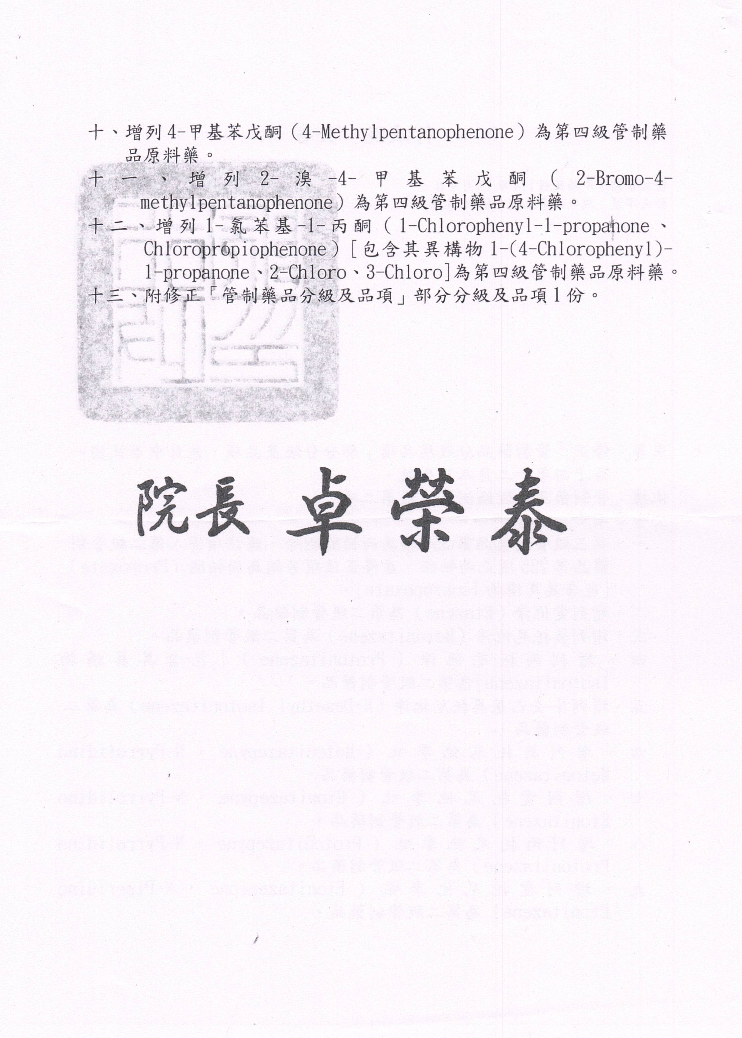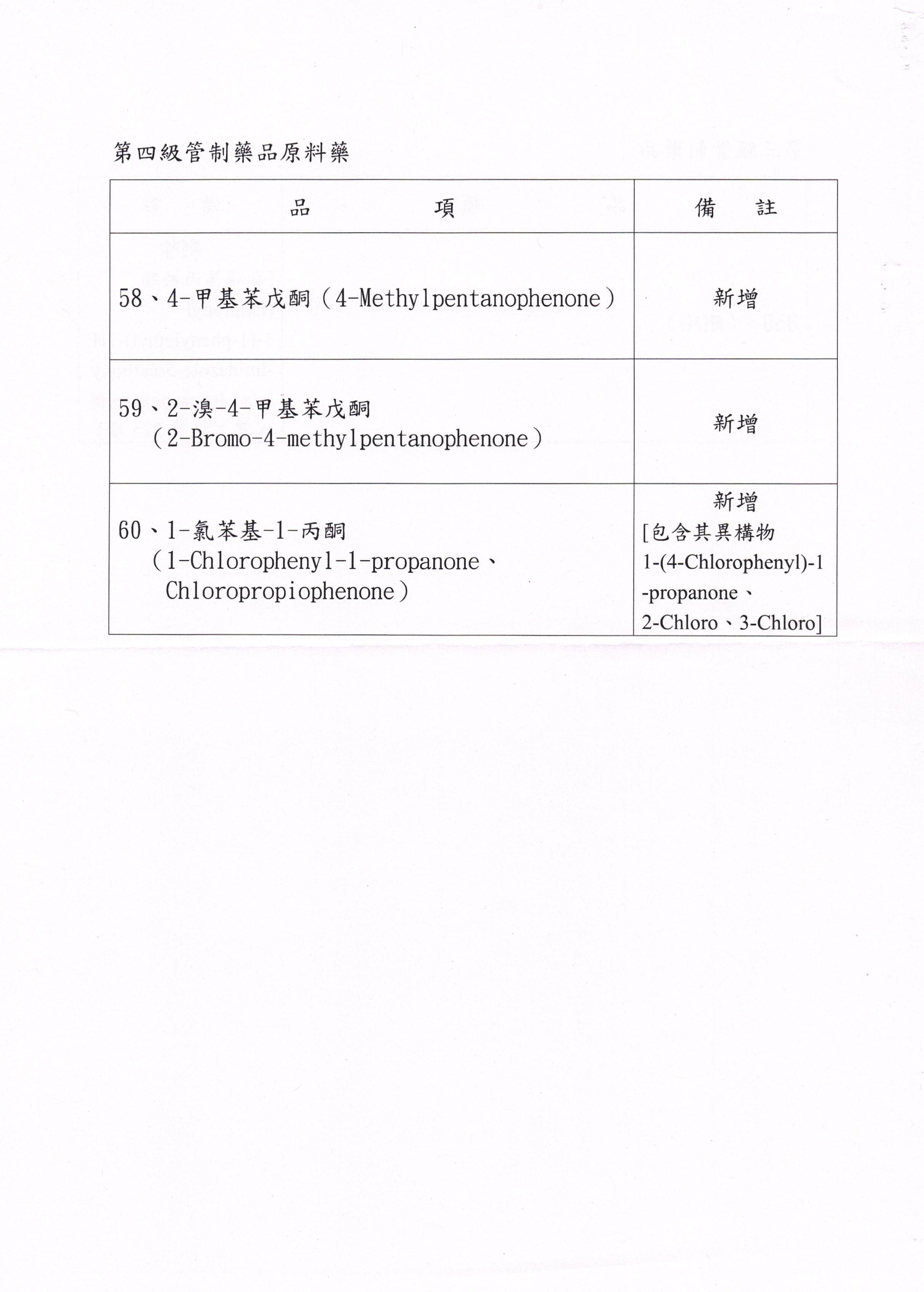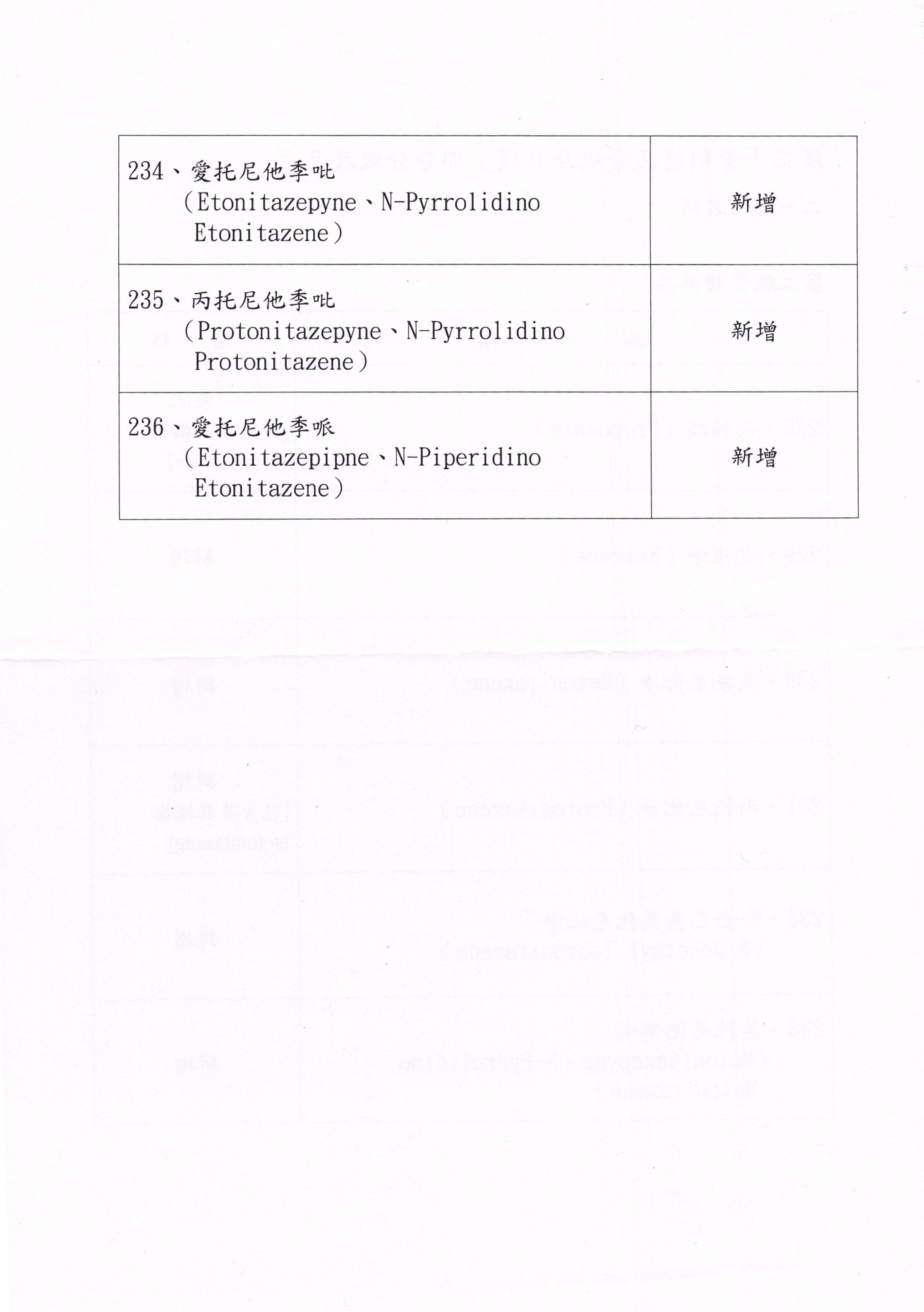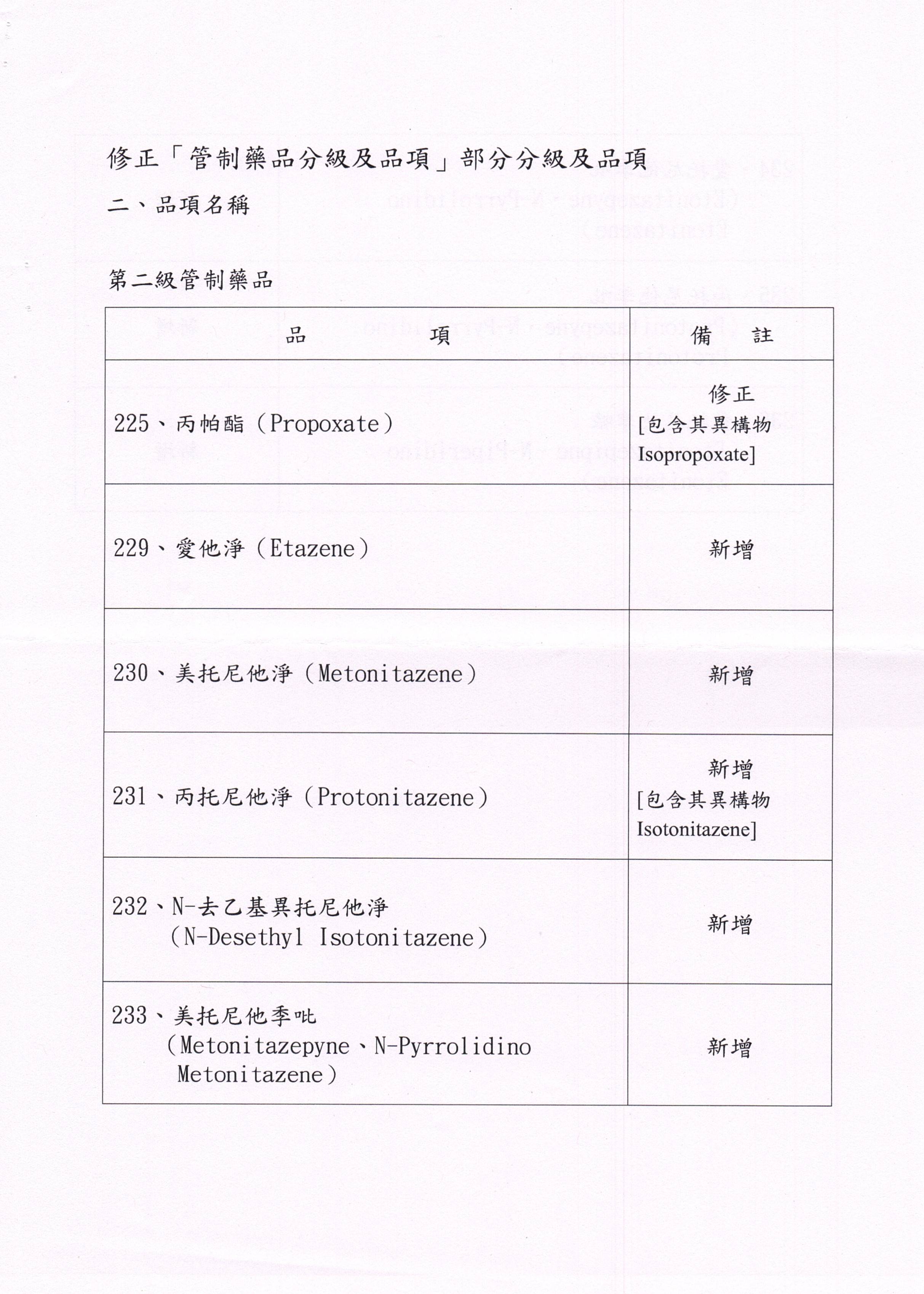 「管制藥品分級及品項」部分分級及品項