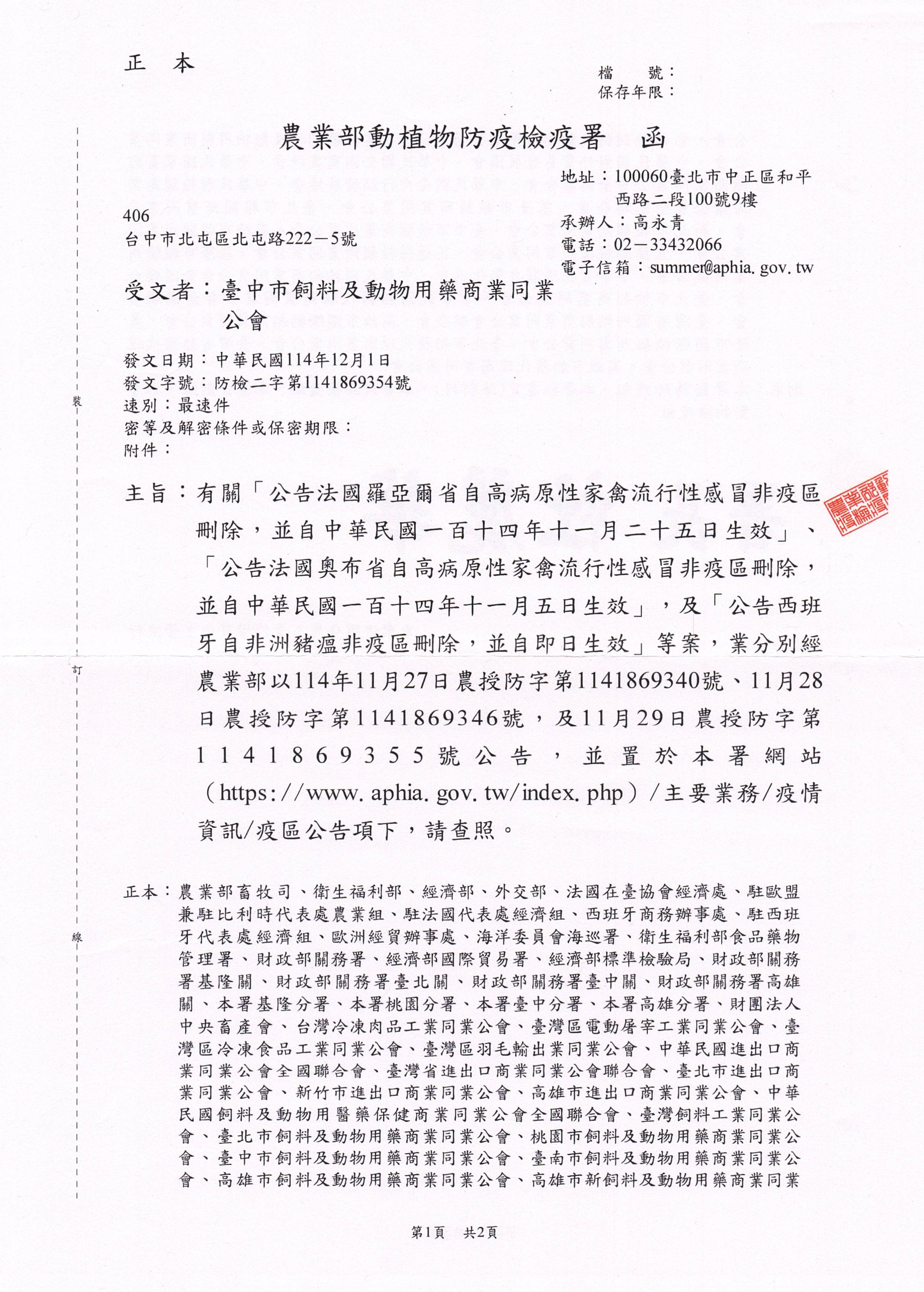 「公告法國羅亞爾省自高病原性家禽流行性感冒非疫區刪除,並自中華民國一百十四年十一月二十五日生效」、「公告法國奧布省自高病原性家禽流行性感冒非疫區刪除,並自非洲豬瘟非疫區刪除,並自即日生效」等案