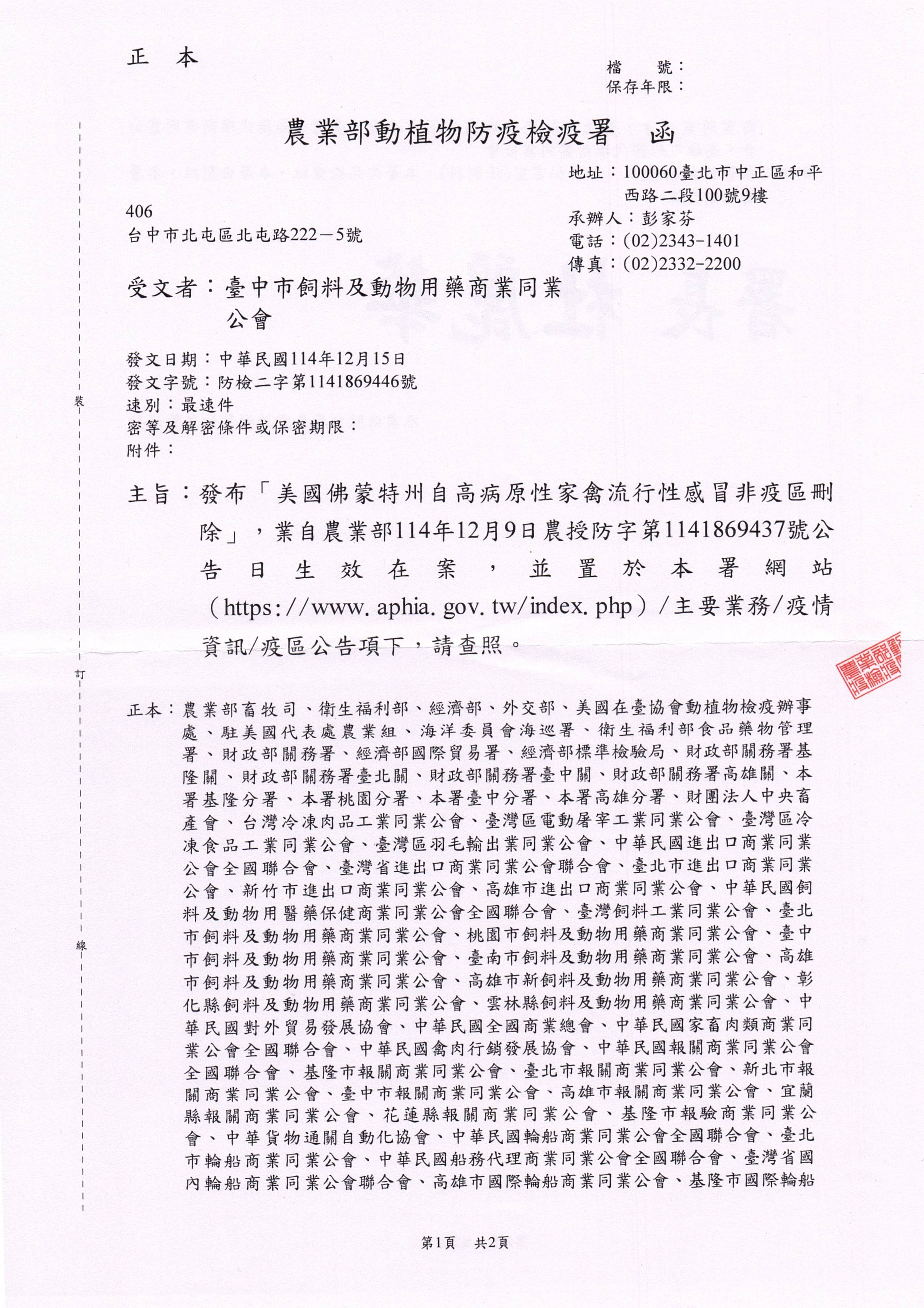 「美國佛蒙特州自高病原性感冒非疫區刪除」