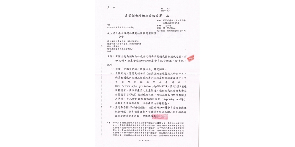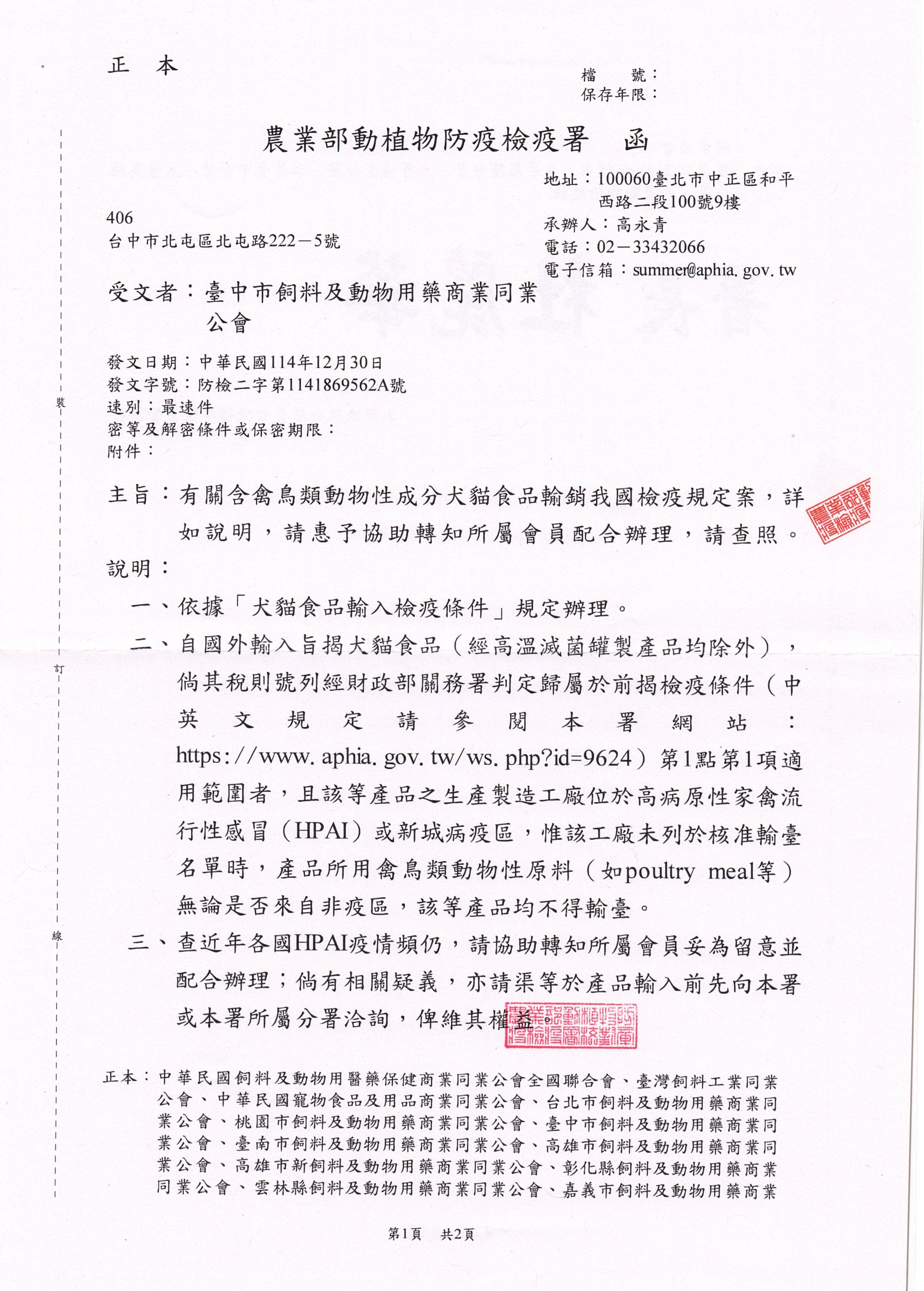 含禽鳥類動物性成分犬貓食品輸銷我國檢疫規定案, 請查照。