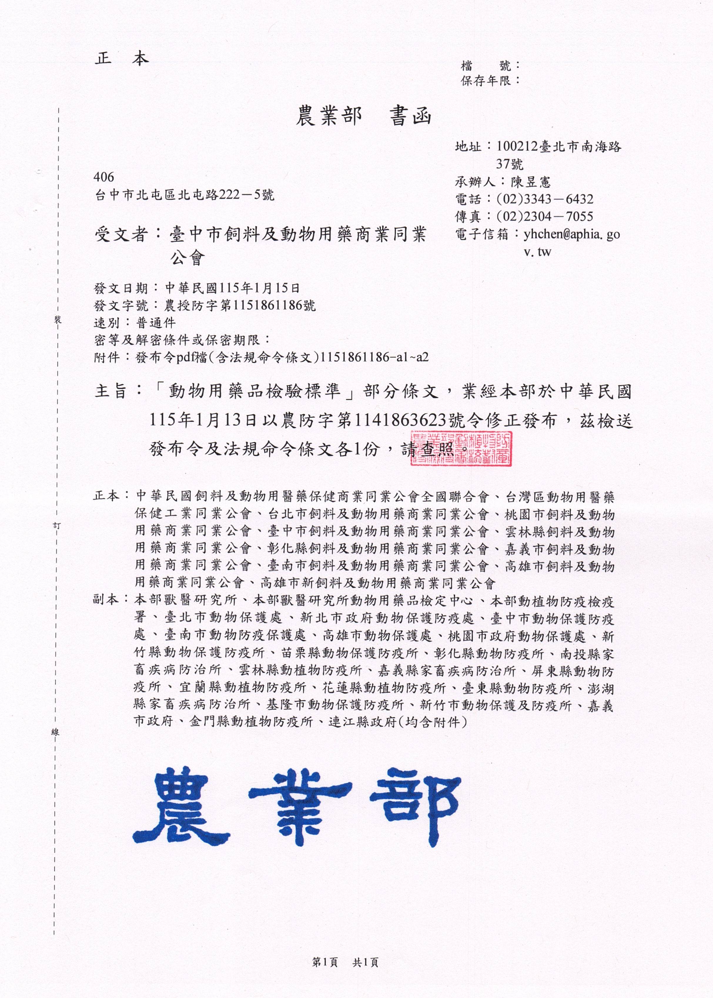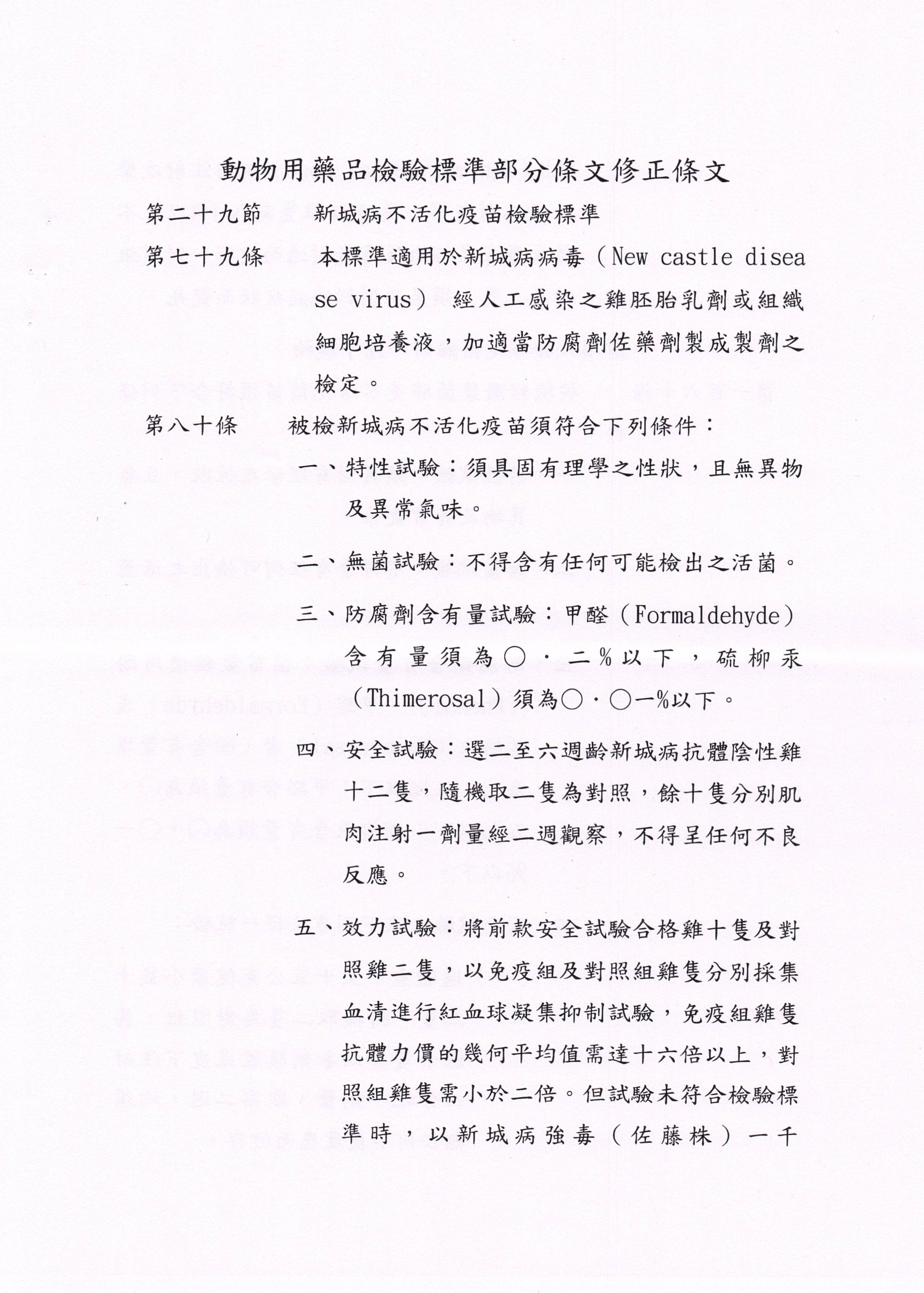 「動物用藥品檢驗標準」部分條文, 請查照。